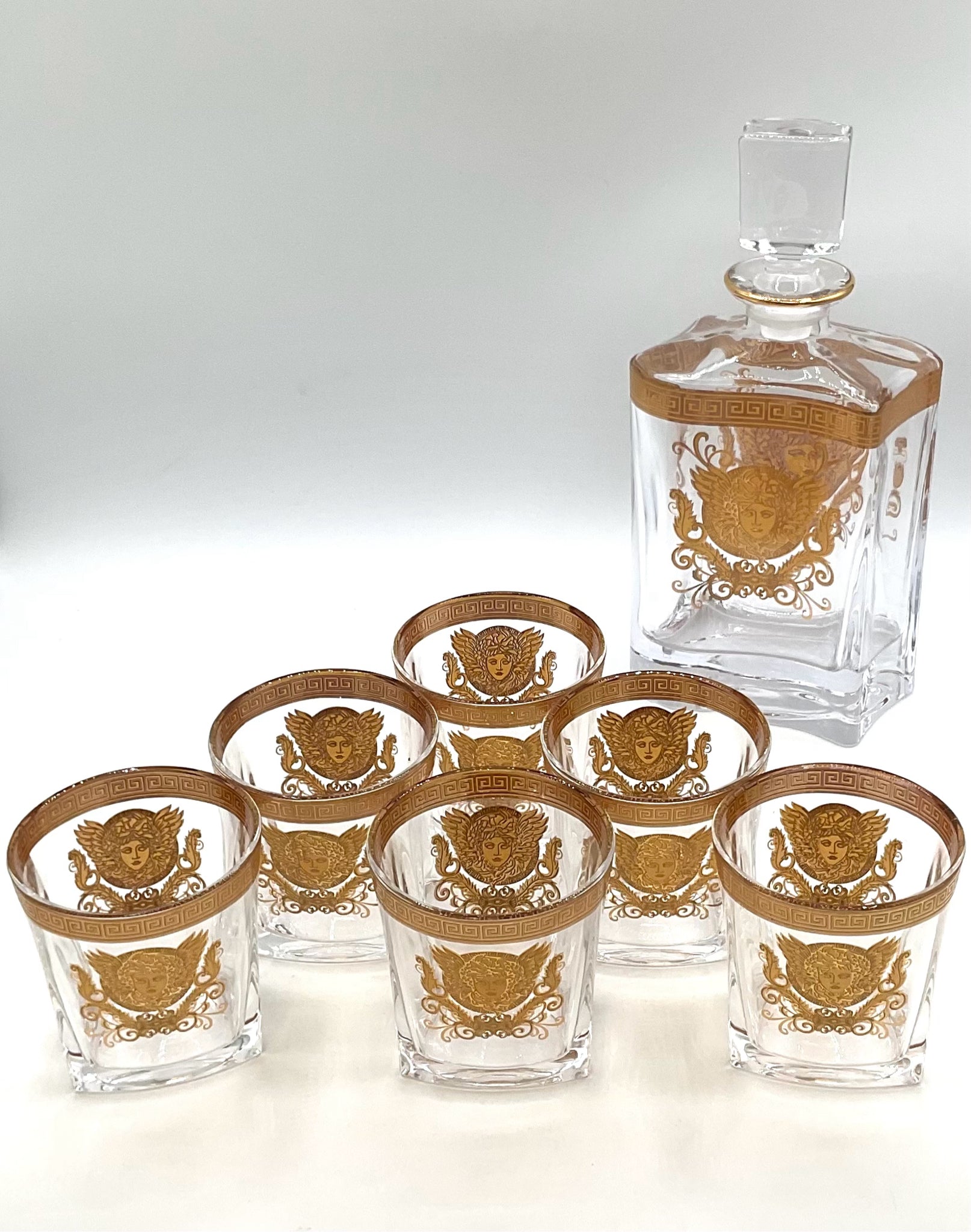 7 Piece Liquor Set 1 clear with gold detailing Decanter 6 lowball glasses