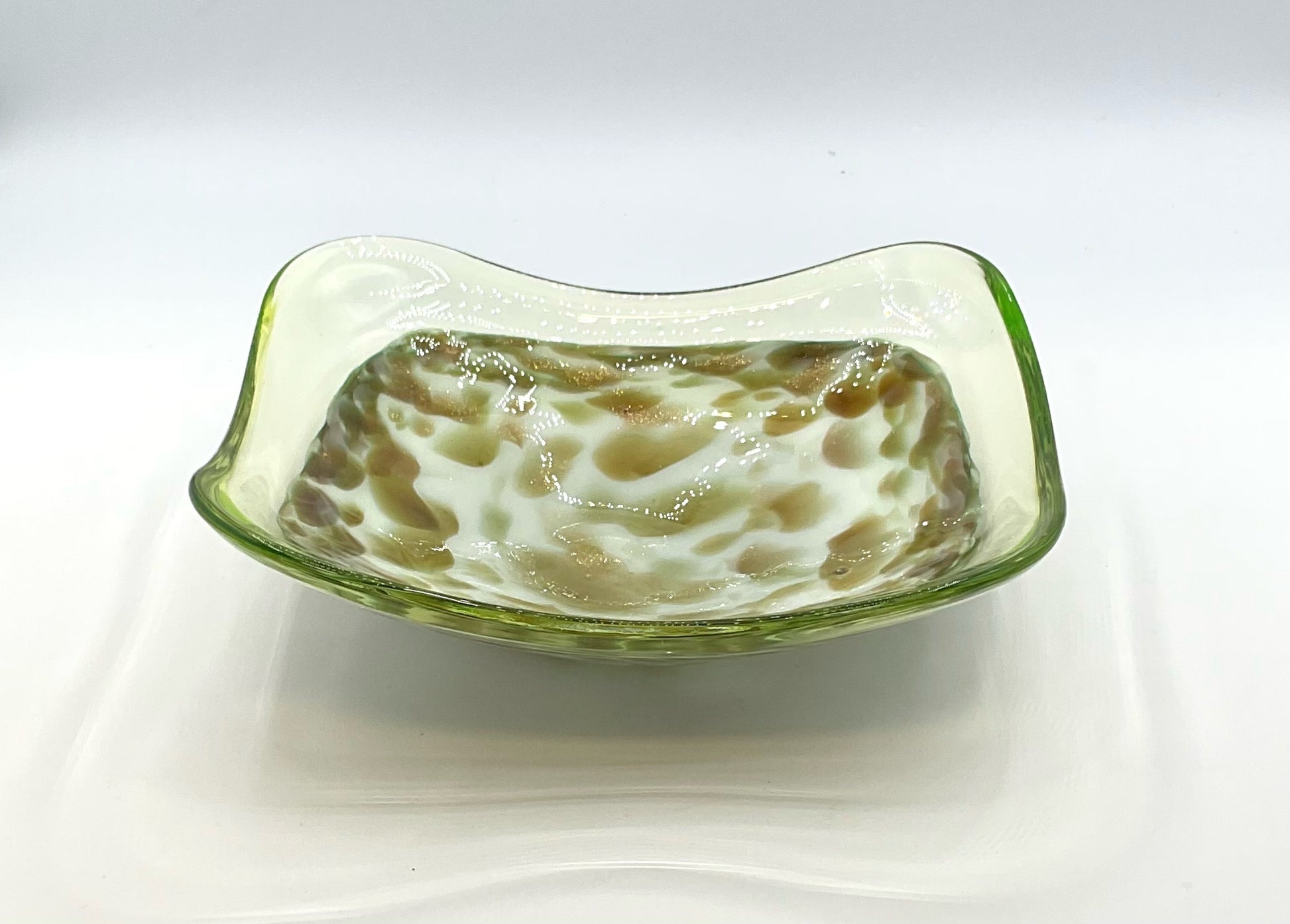 Bowl art glass square green & white with gold flecks