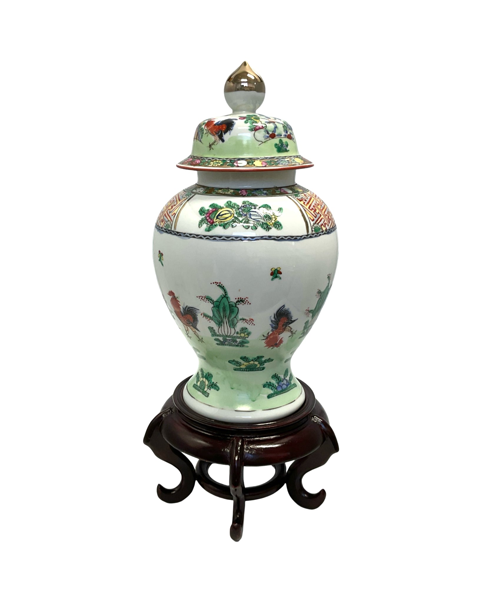 Ginger Jar with Lid on Wooden Stand signed ceramic white with roosters & floral detailing