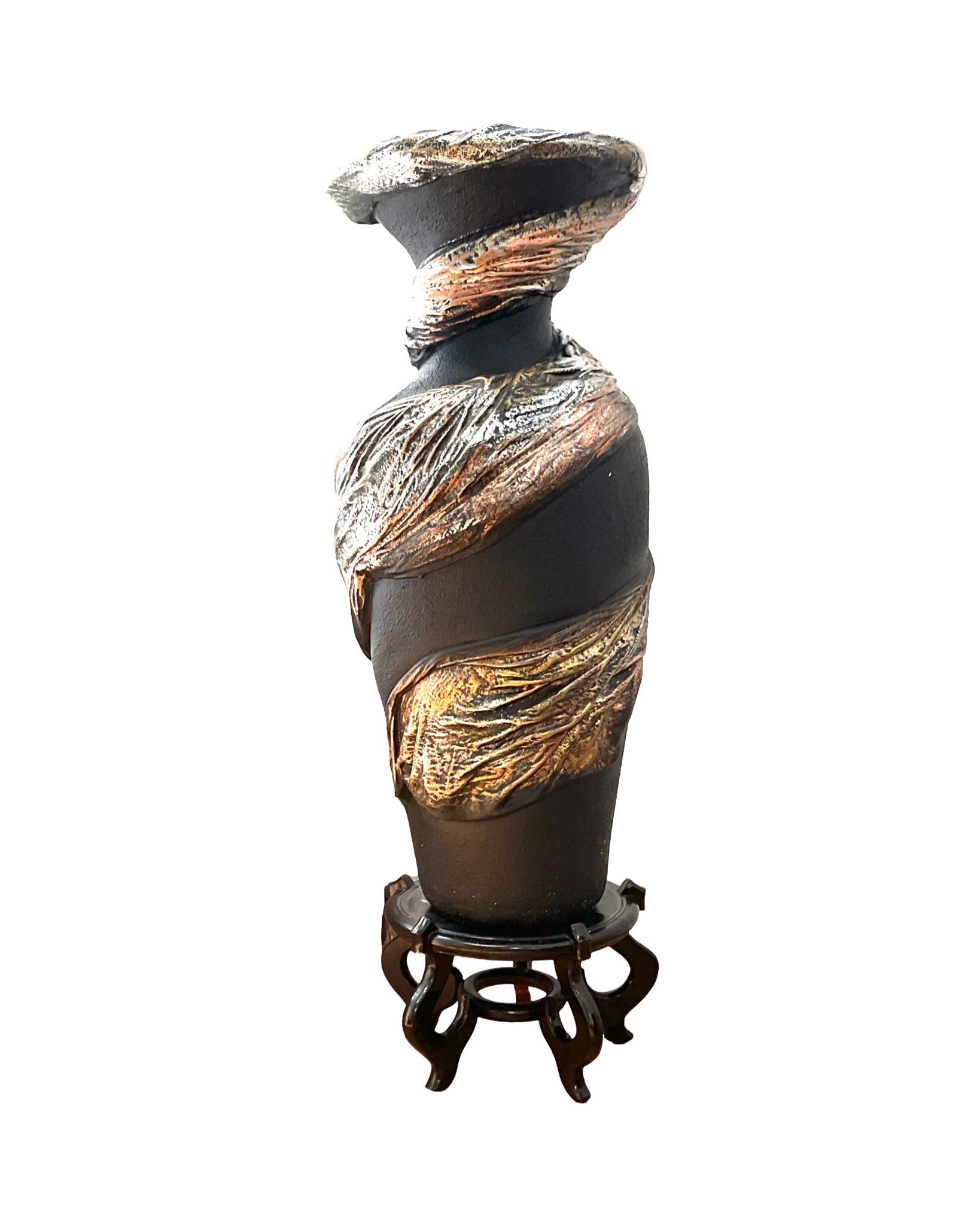 Large Floor Vase on Wooden Stand black with silver & gold detailing
