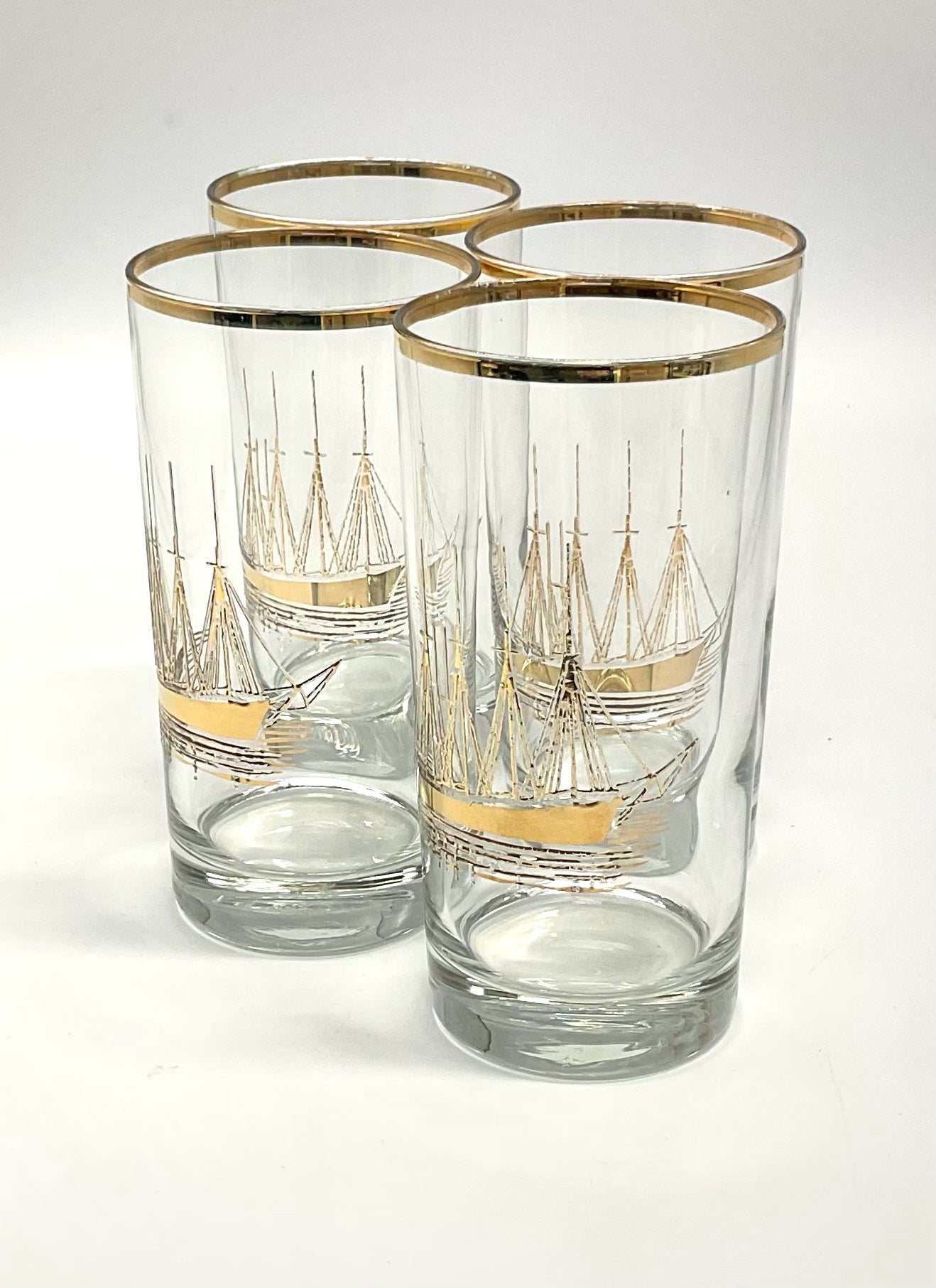 Set of 4 Highball Glasses glass with gold detailed ship & rim