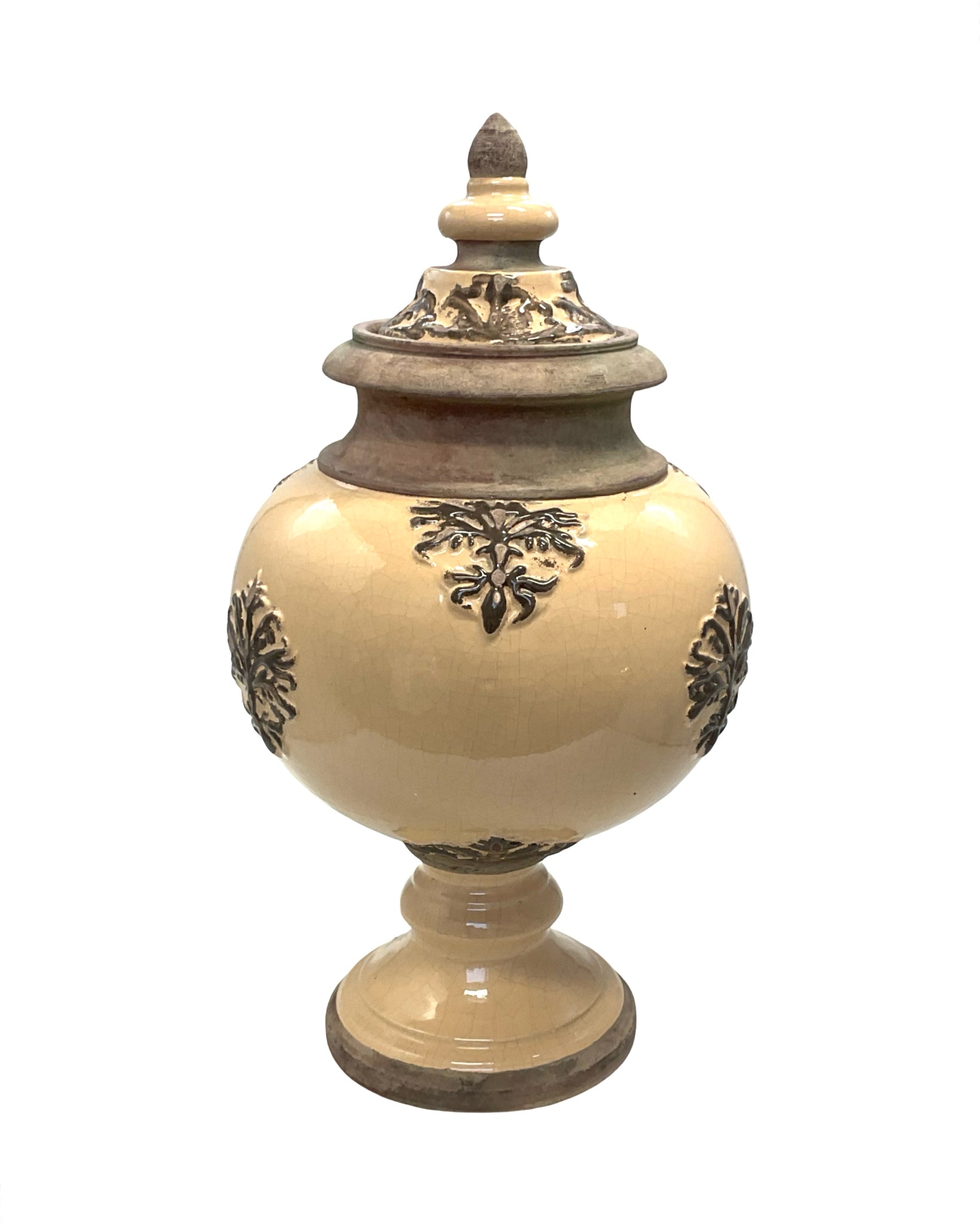 Urn with Lid pottery cream tone crackle finish with floral detailing