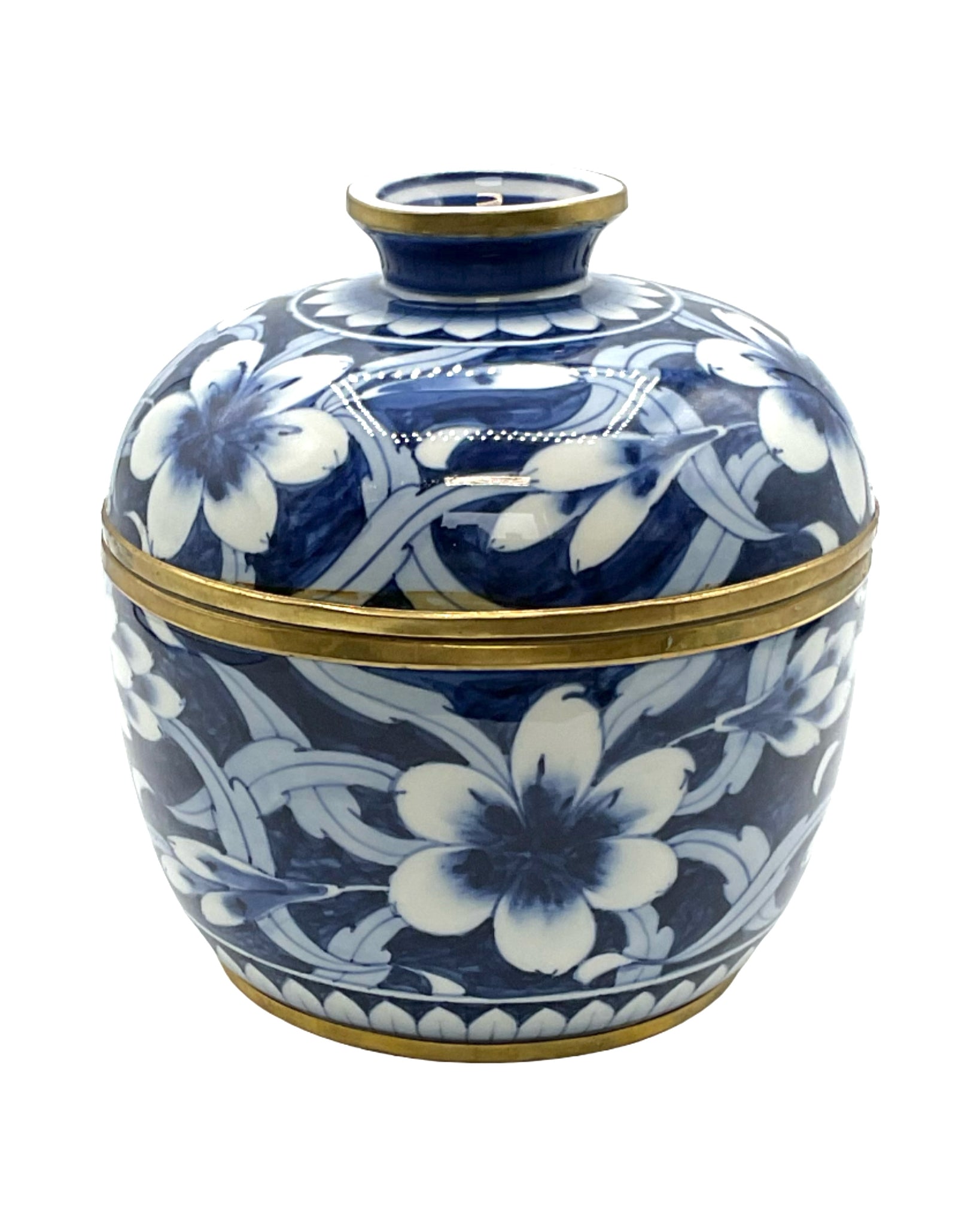 Jar with Lid porcelain blue with white flowers & gold detailing