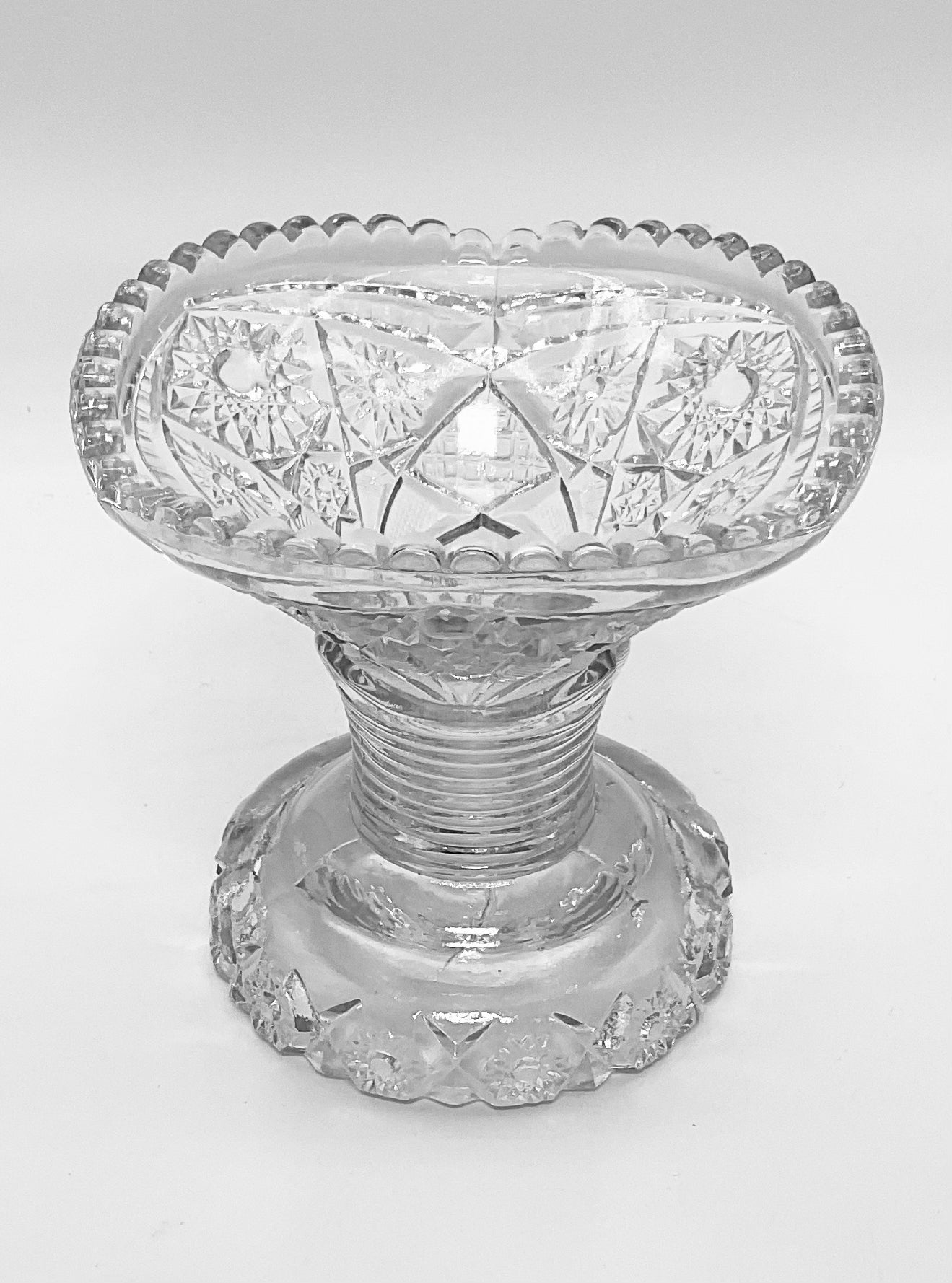 Vintage Pedestal Vase cut glass sawtooth edge etched & ribbed pattern