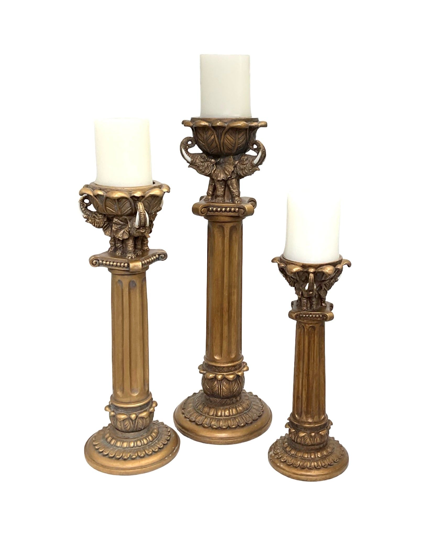 Set of 3 Pillar Candle Holders gold tone pillar base elephant detailing with pillar candles