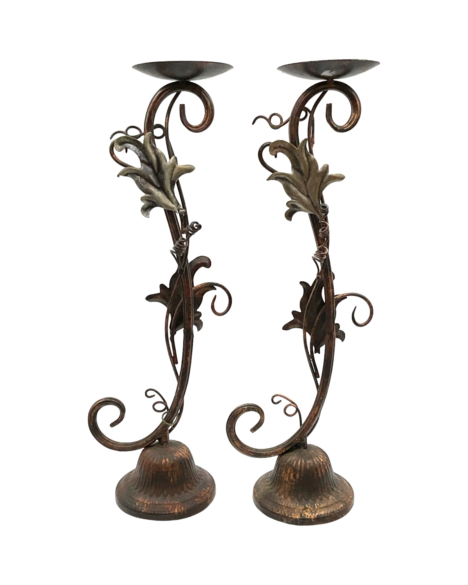 Set of 2 Candle Holders metal antique finish with leaf & vine motif