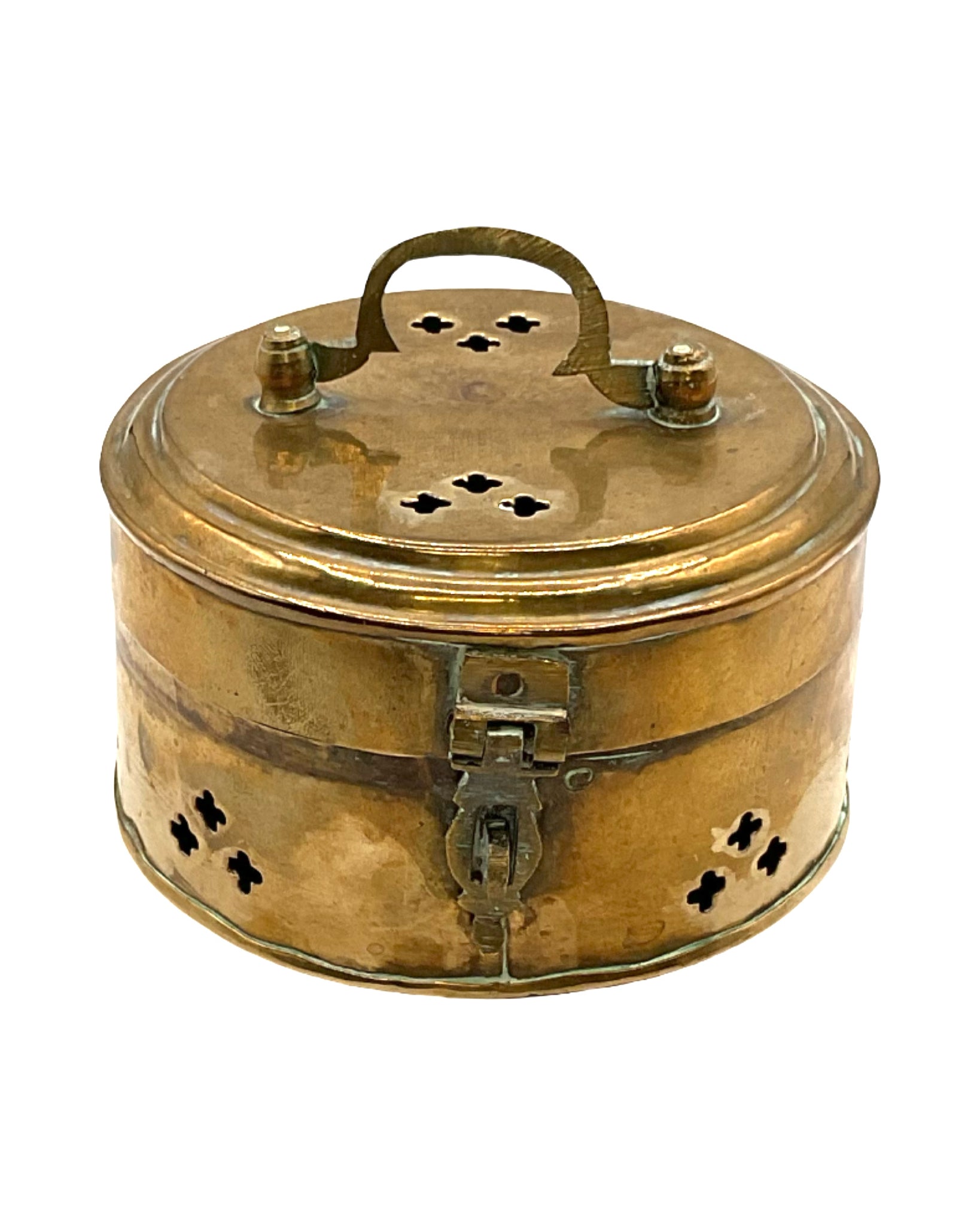 Vintage Treasure Box with Handle and Hinged Lid round brass with floral cut outs