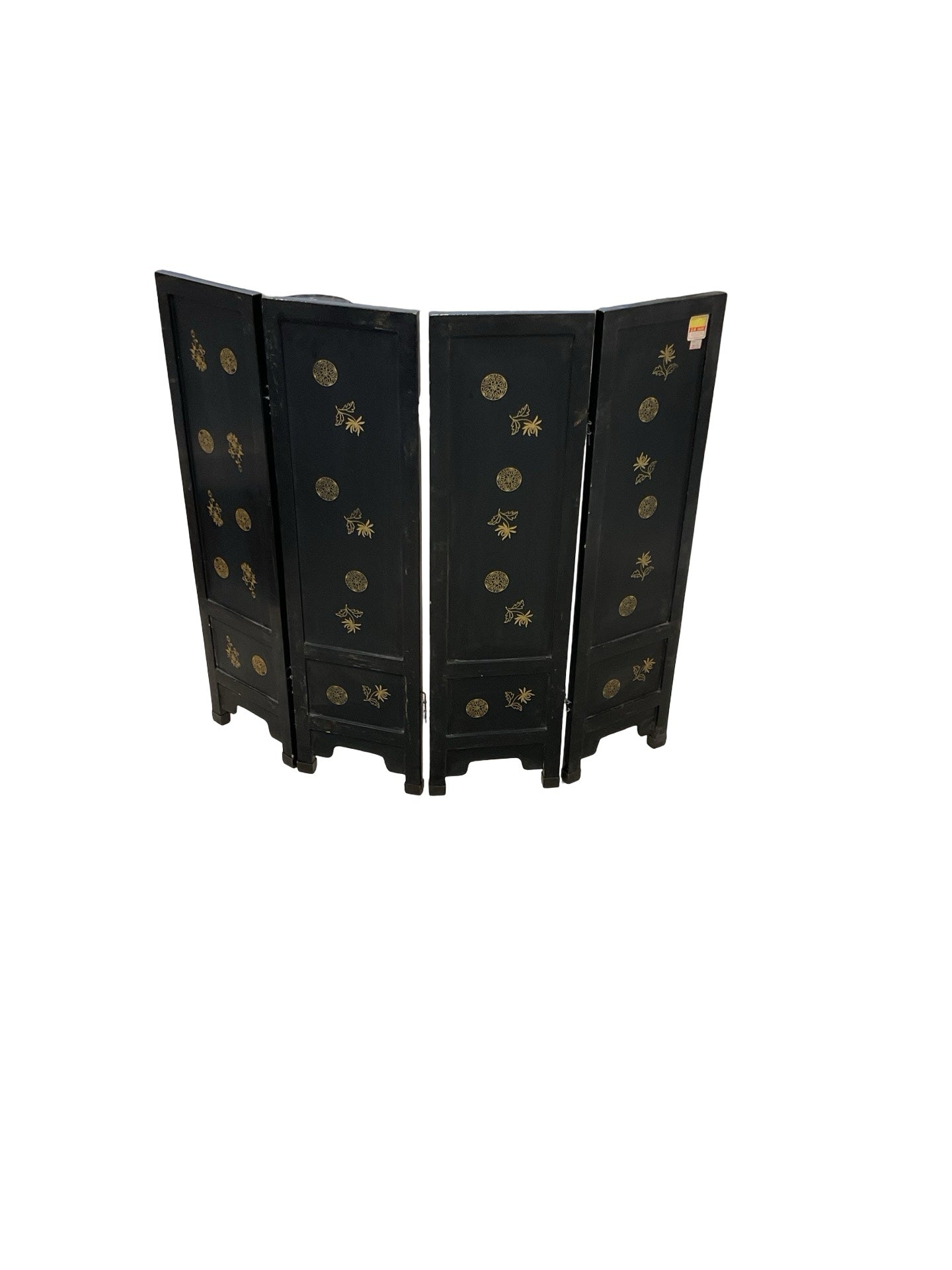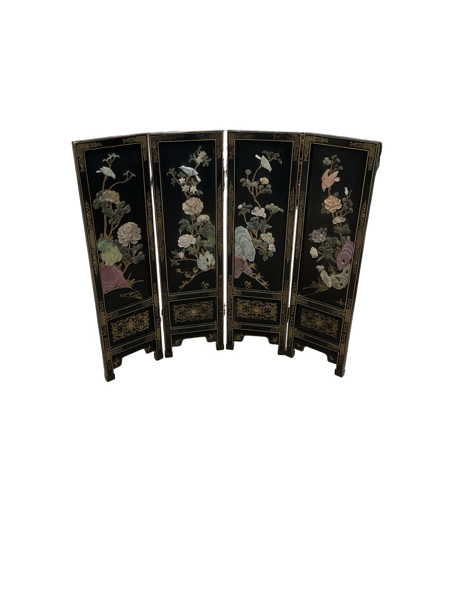 Asian Screen 4 panels wooden black stone floral & bird motif