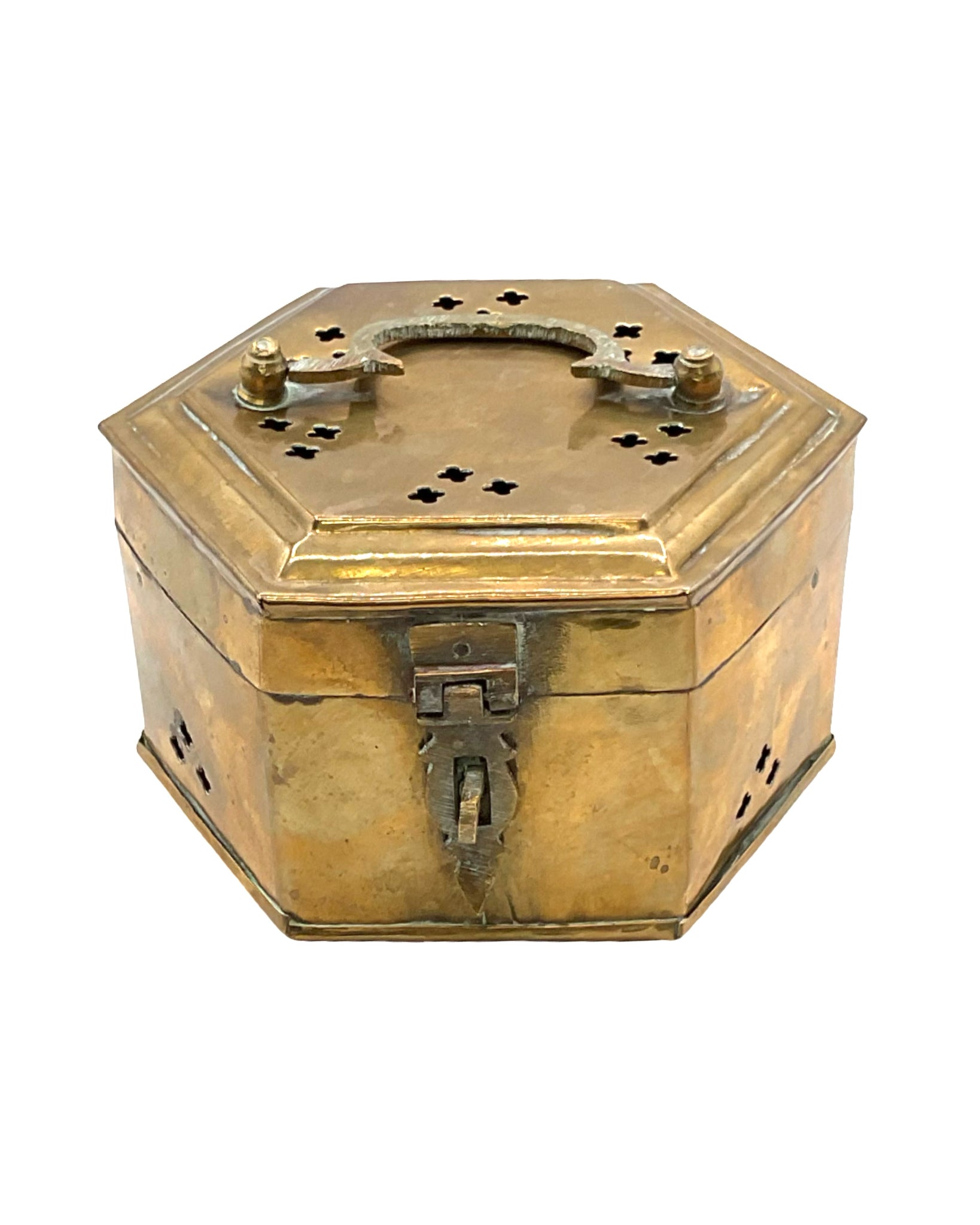 Vintage Treasure Box with Handle and Hinged Lid hexagon brass with floral cut outs