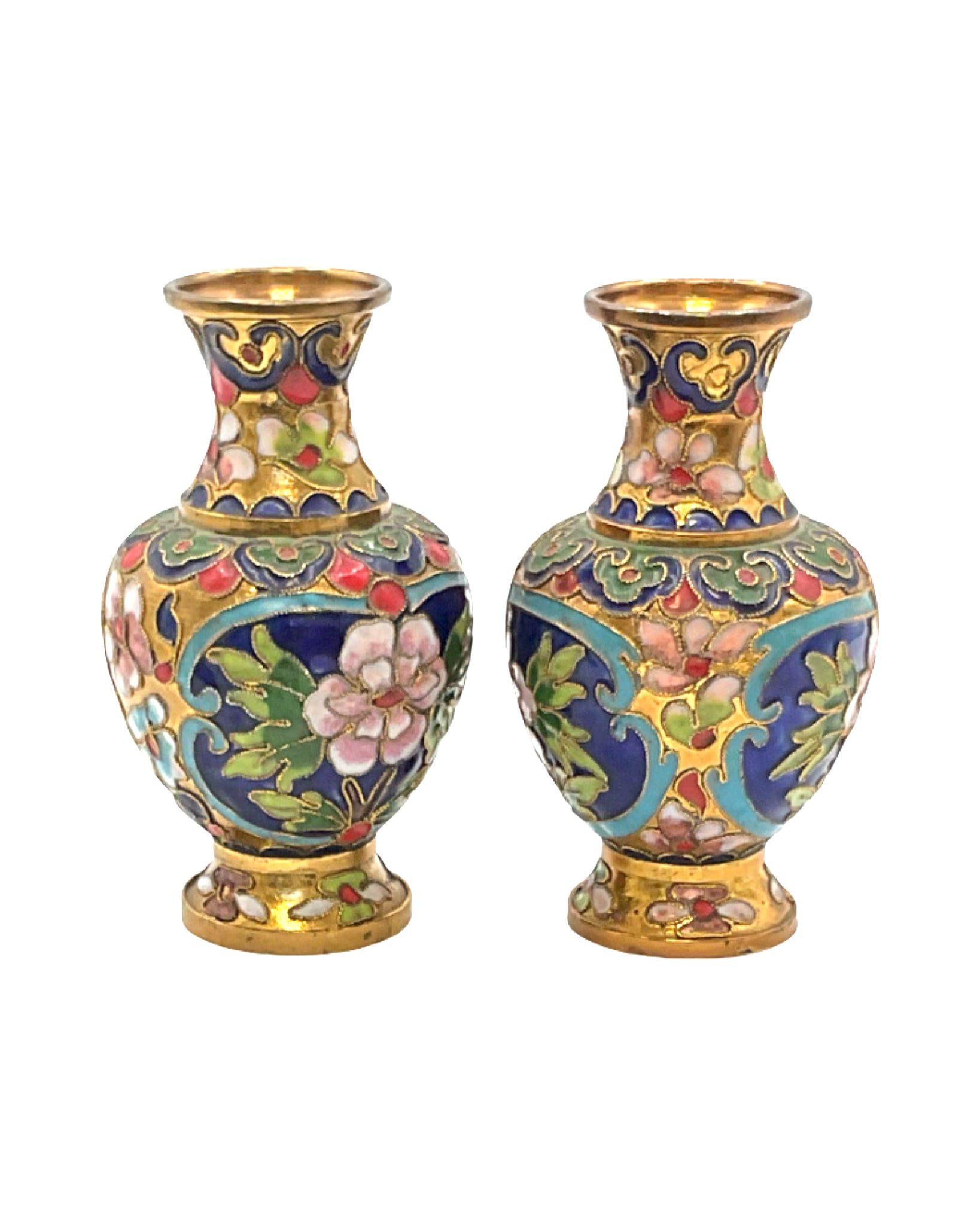 Set of 2 Miniature Vases cloisonne brass with multi coloured floral detailing