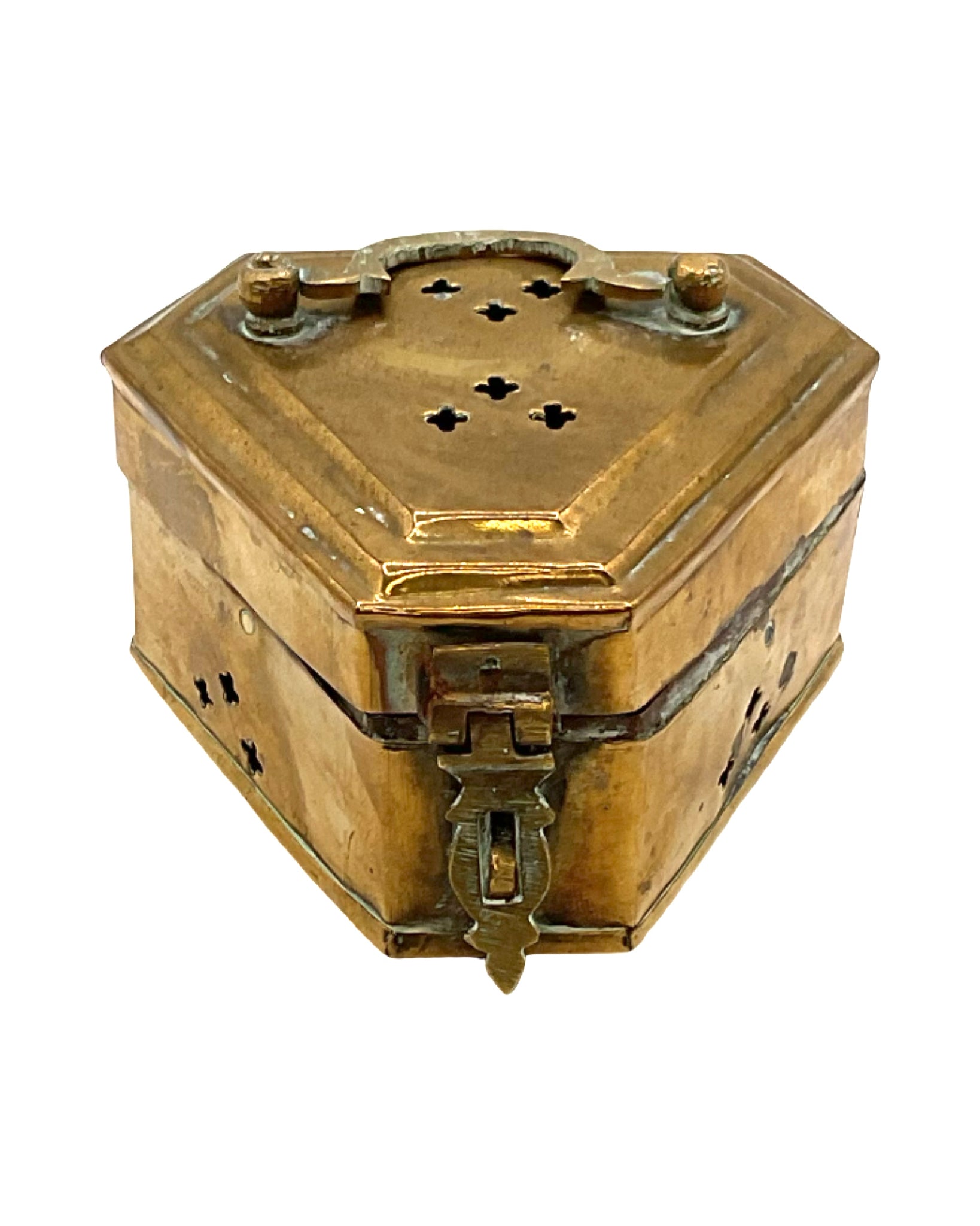 Vintage Treasure Box with Handle and Hinged Lid triangle brass with floral cut outs