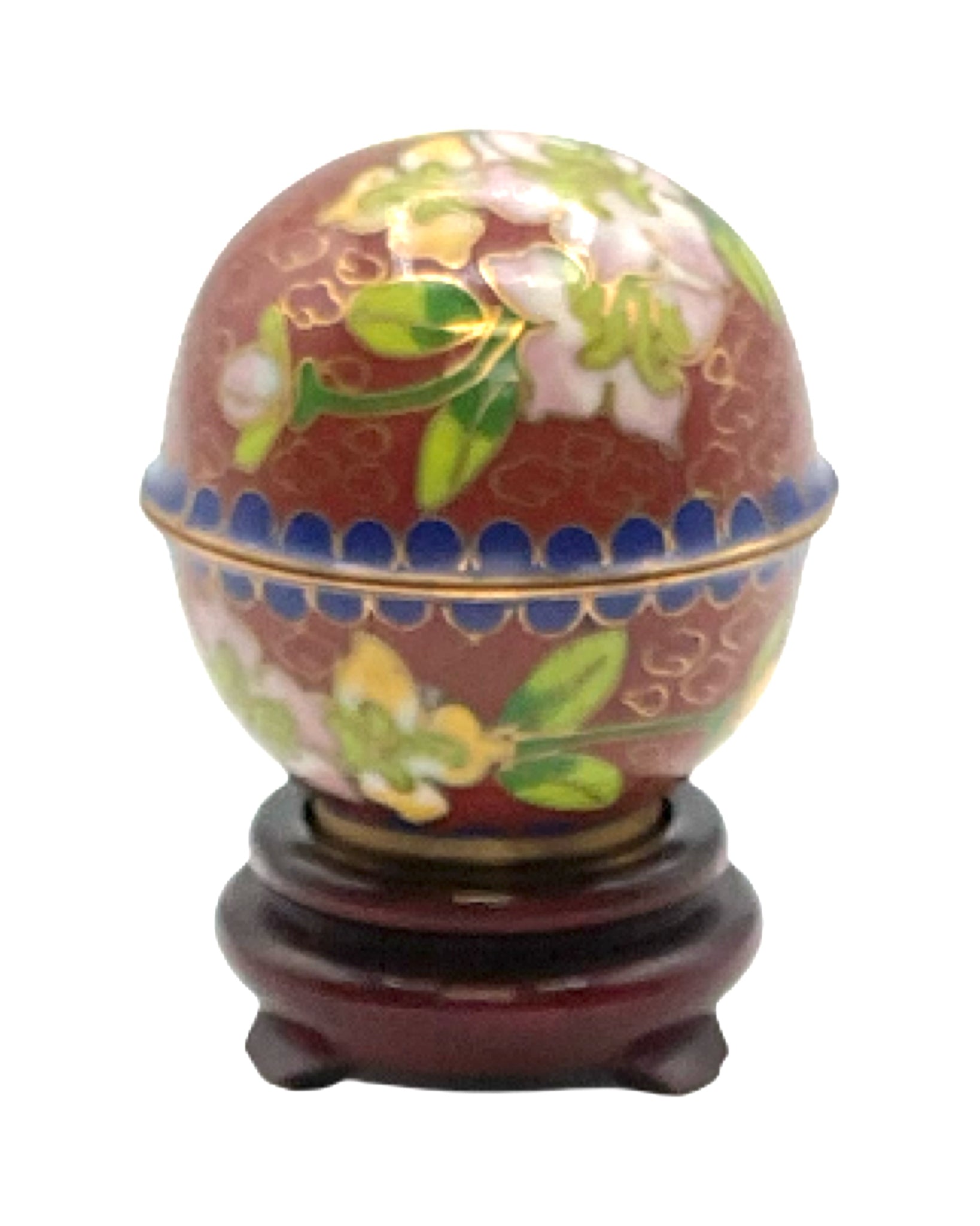 Trinket Box with Lid on Wooden Stand Cloisonne Orb red & floral with brass detailing 1.5"H