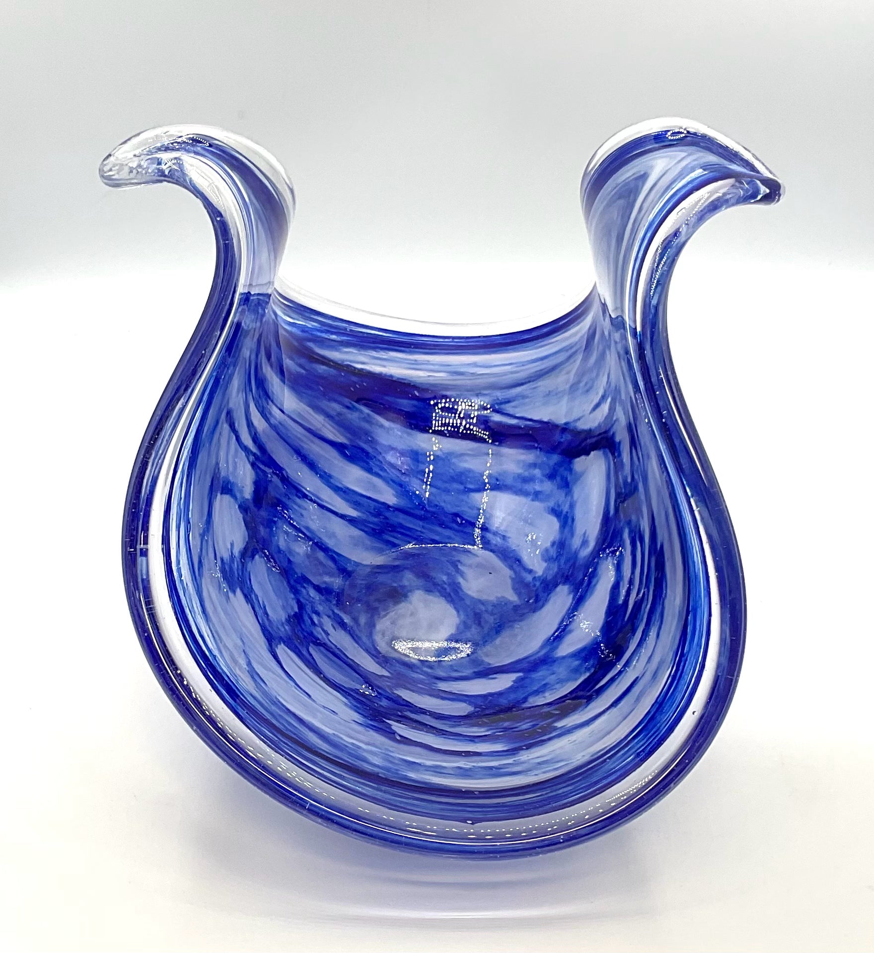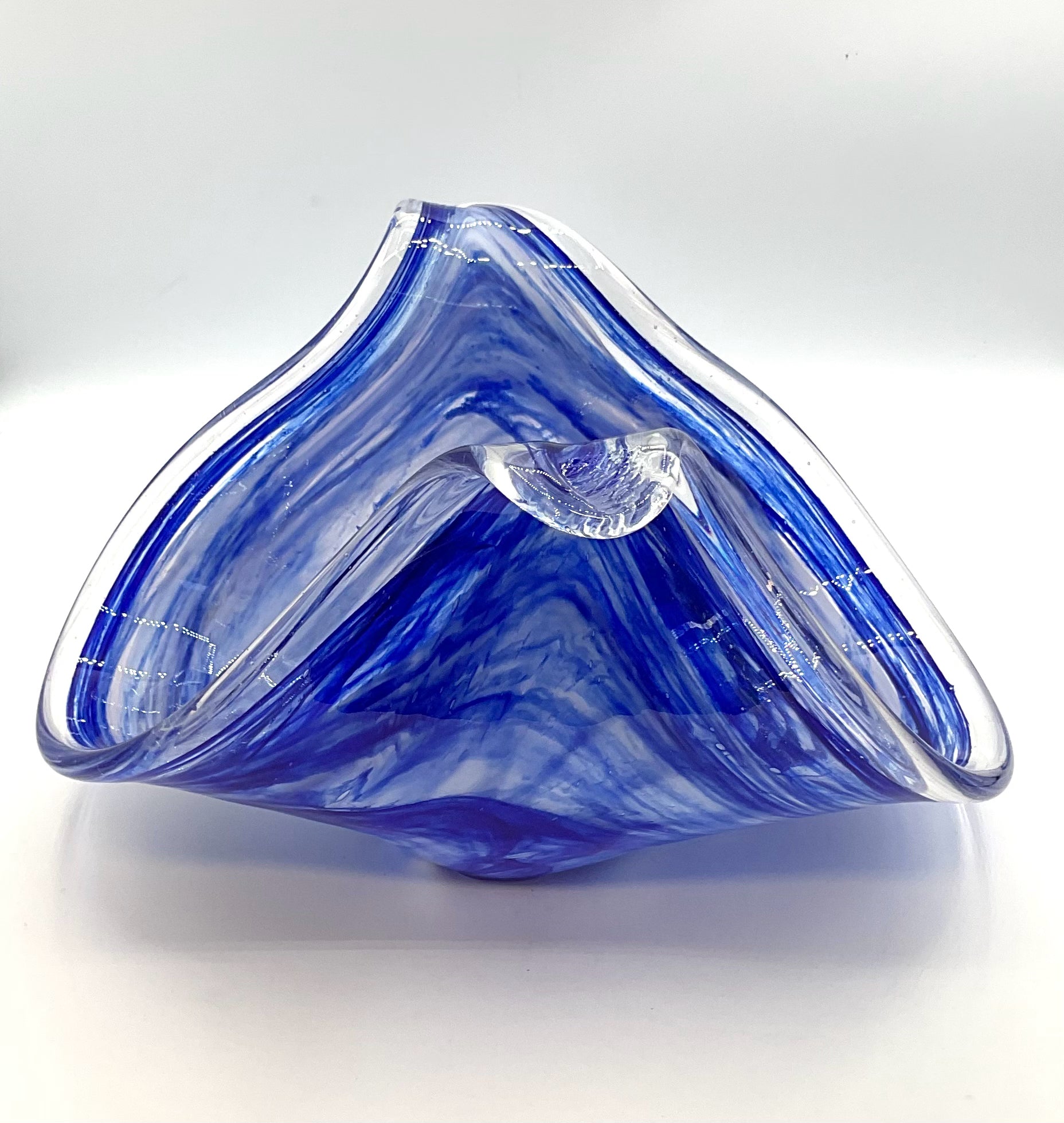 Large Decorative Bowl art glass clear white blue with folded over sides