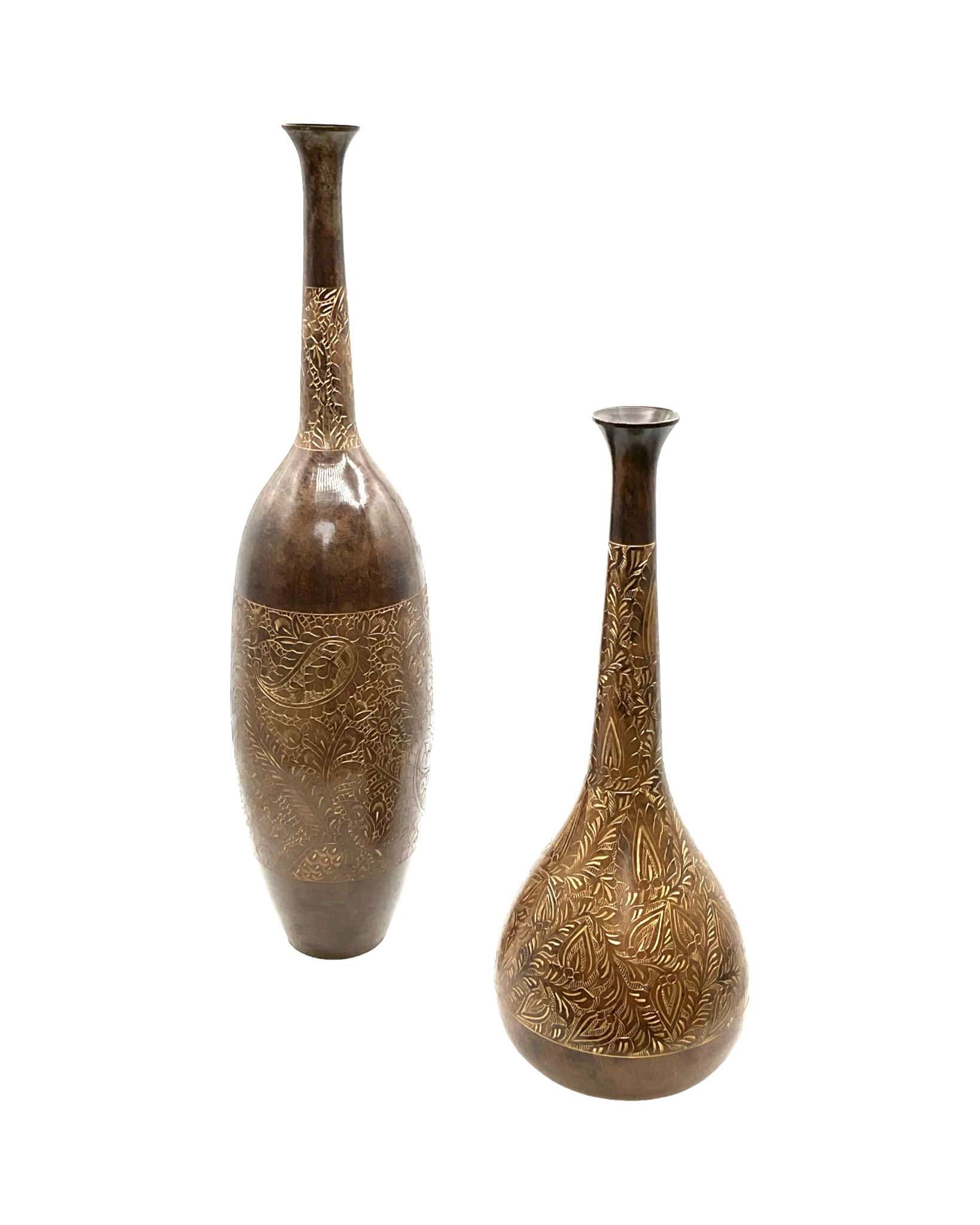 Set of 2 Vases metal hand etched floral detailing
