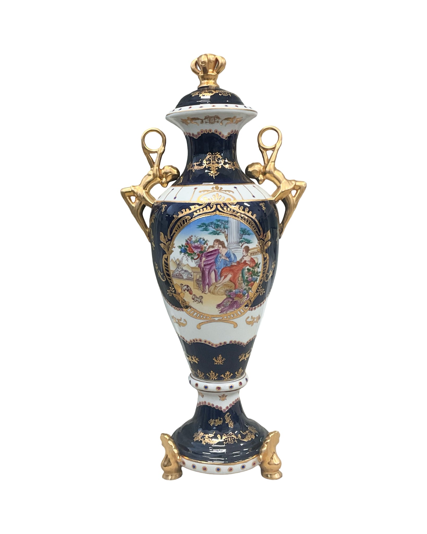 Large Floor Vase with Lid Sevres-Style porcelain cobalt blue white & gold gilt