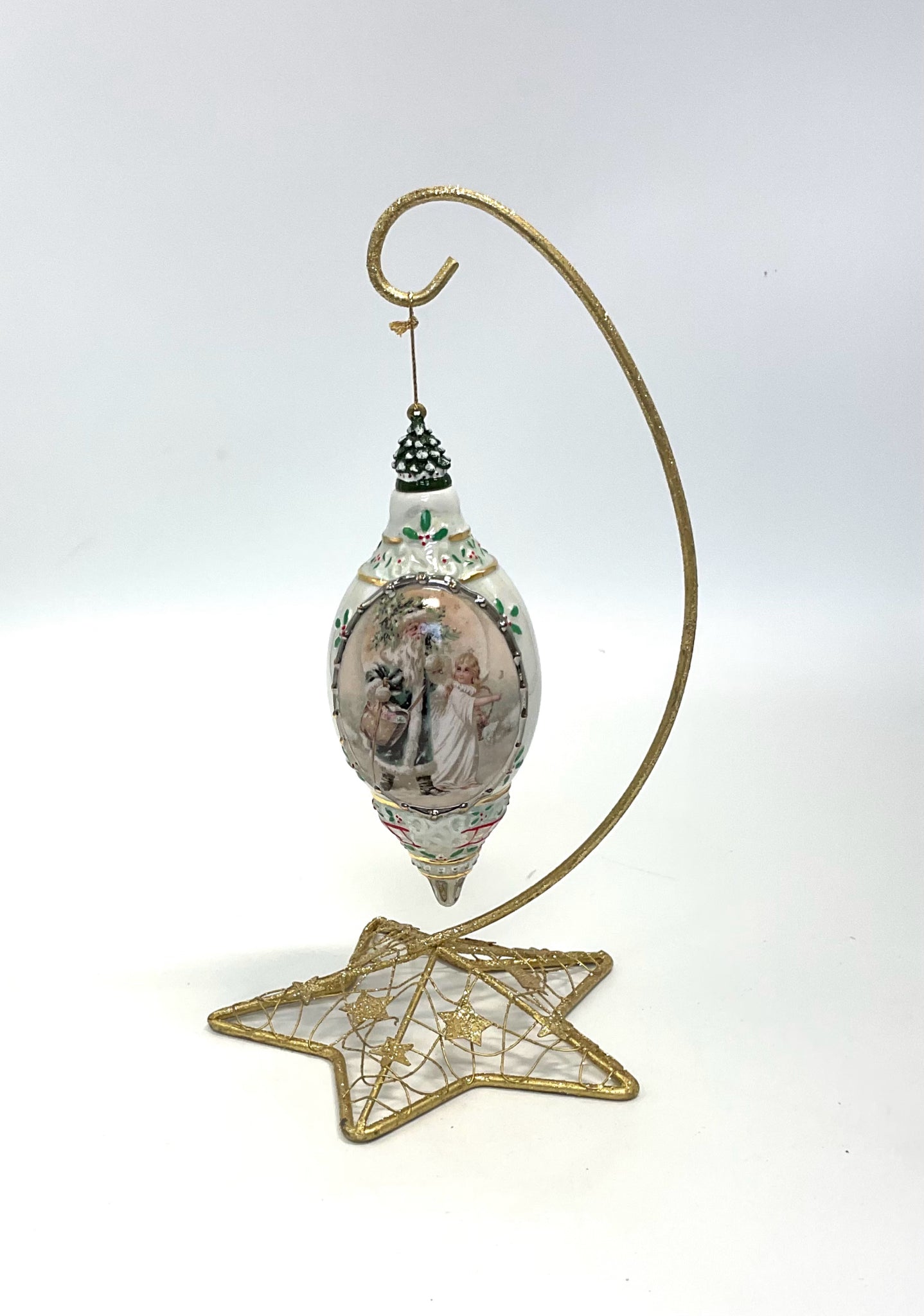 Christmas Ornament on Metal Stand victorian Santa with Angel Santas Little Helper