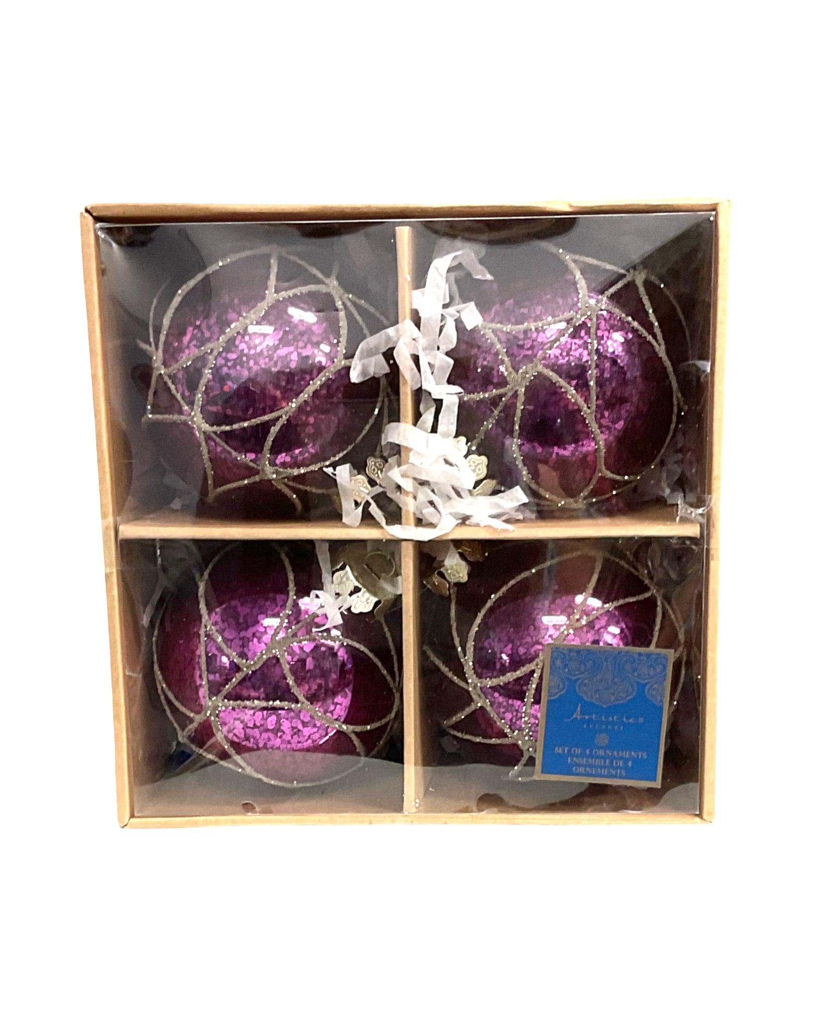 Christmas Set of 4 Ornaments glass purple with gold detailing
