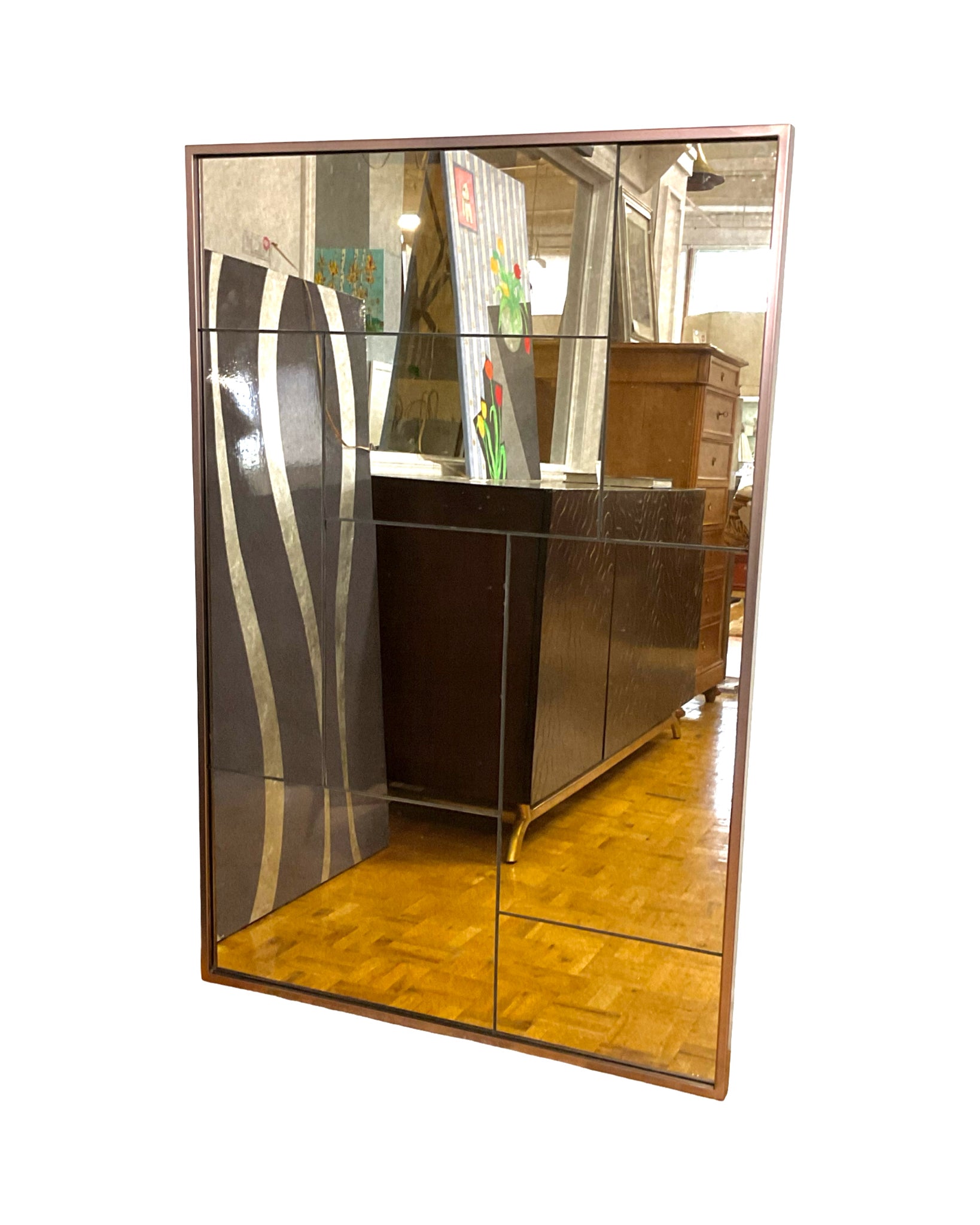 Mirror rectangle bronze tone frame with smokey rectangle etched mirrors 36"W x 54"H
