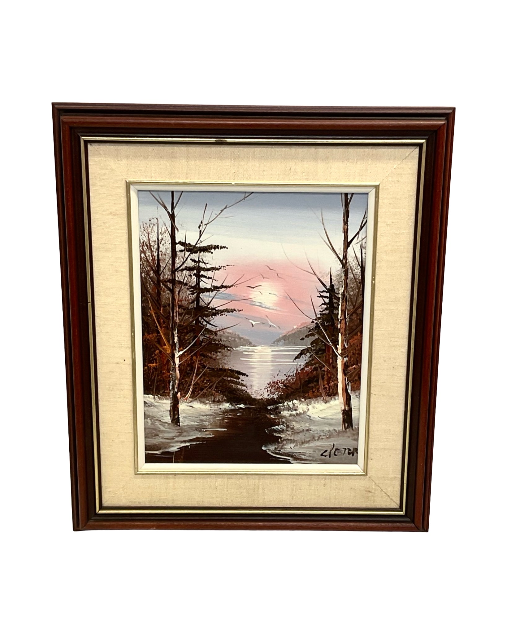Artwork signed Sunset on the Lake in wooden frame 13"W x 15"H