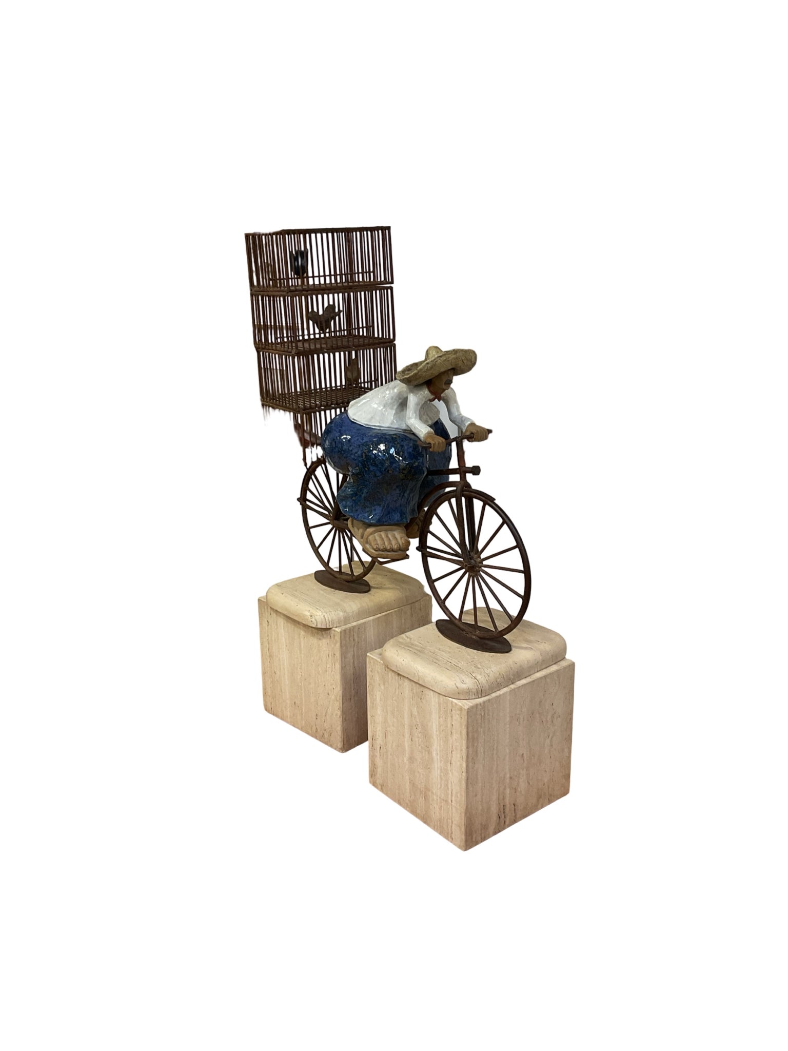 Sculpture Rodo Padilla Mexico Magical Bird Keeper ceramic and metal Man with Bicycle & Bird Cage on stone pedestals