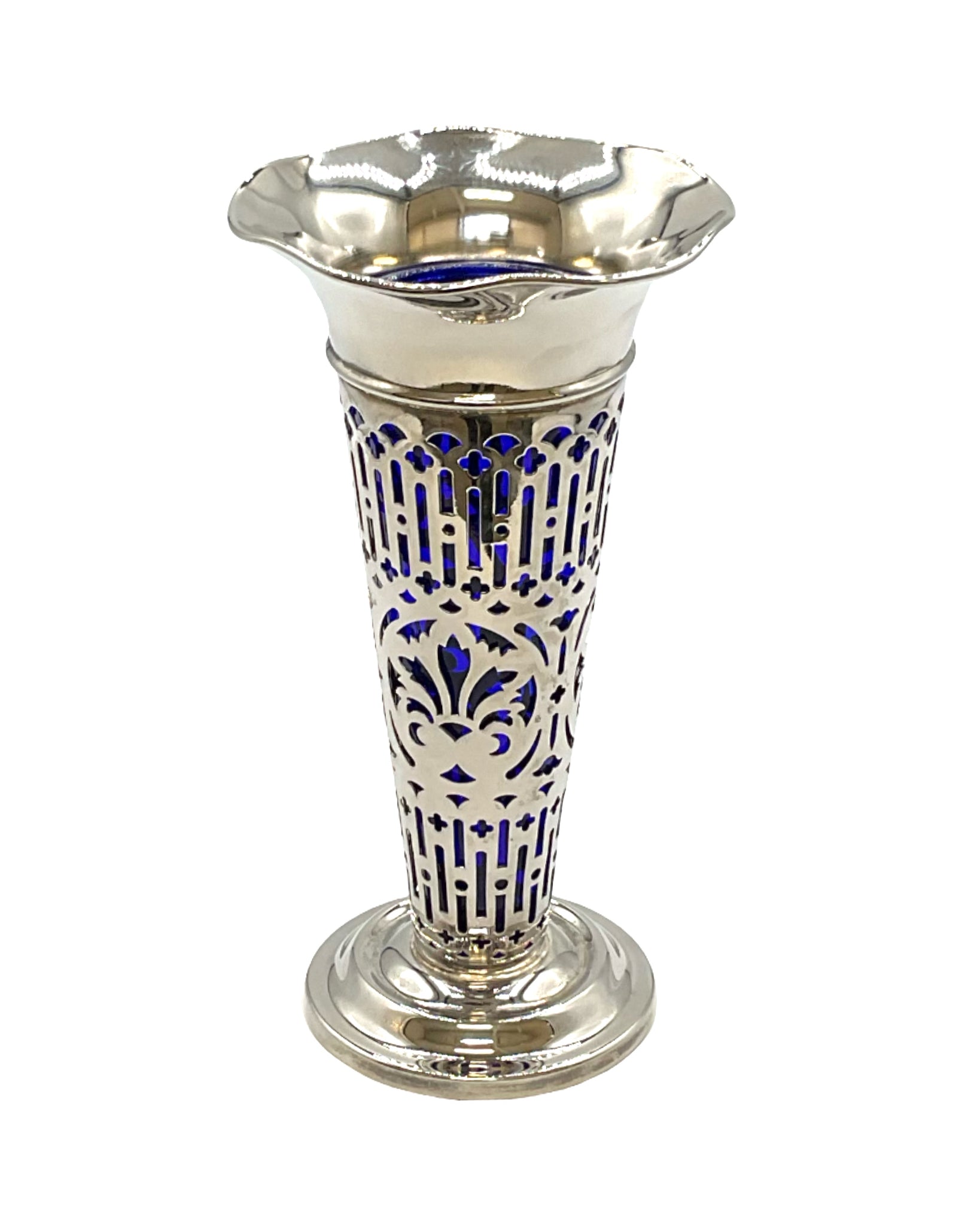 Vase Godinger silver plate pierced detailing with glass cobalt blue insert