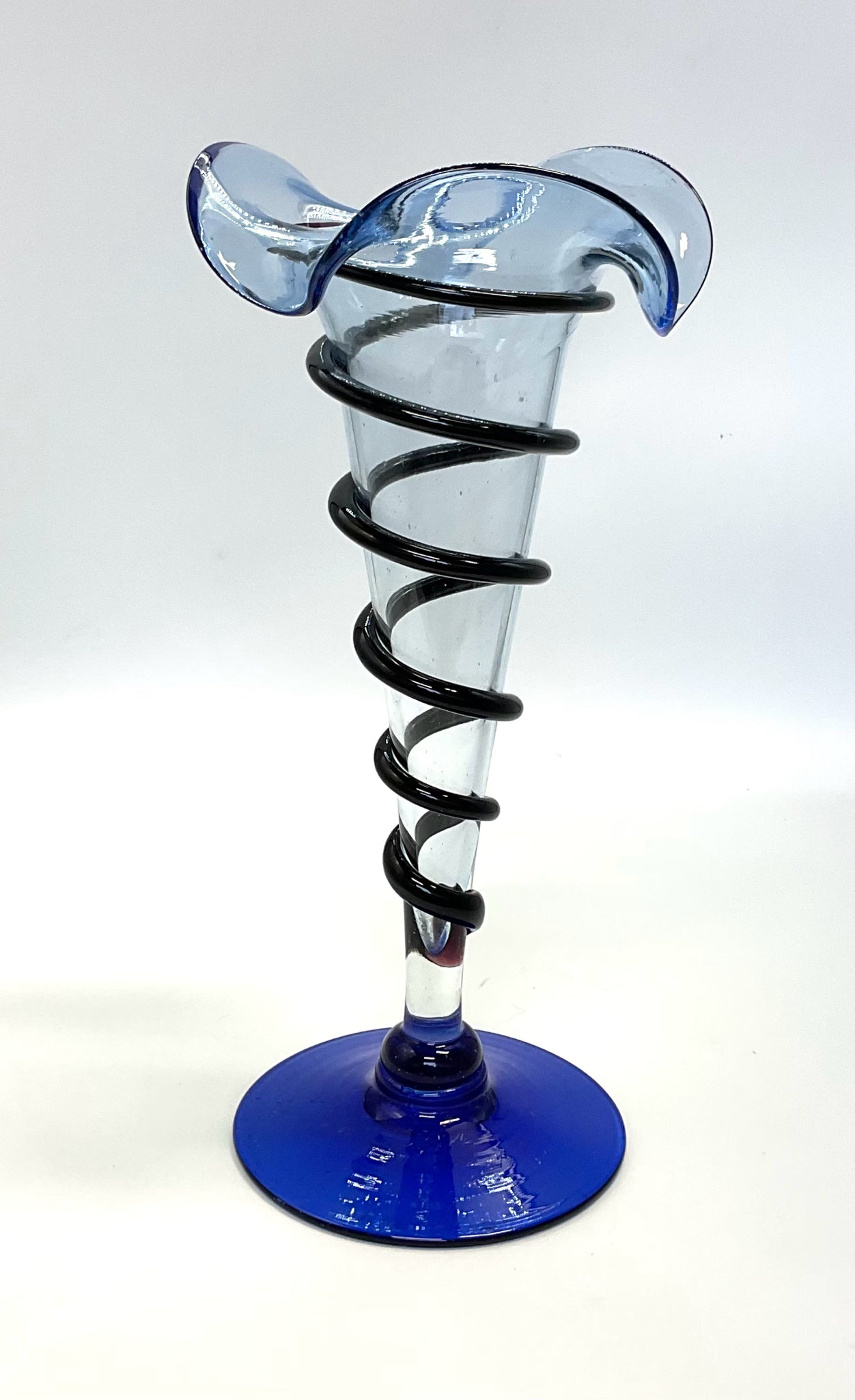 Vase art glass handkerchief top clear & cobalt blue with black spiral detailing