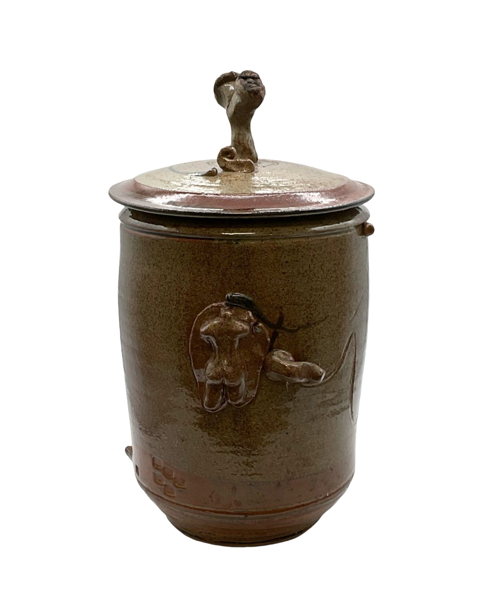 Jar with Lid Signed pottery taupe & brown speckled detailing with abstract anatomy