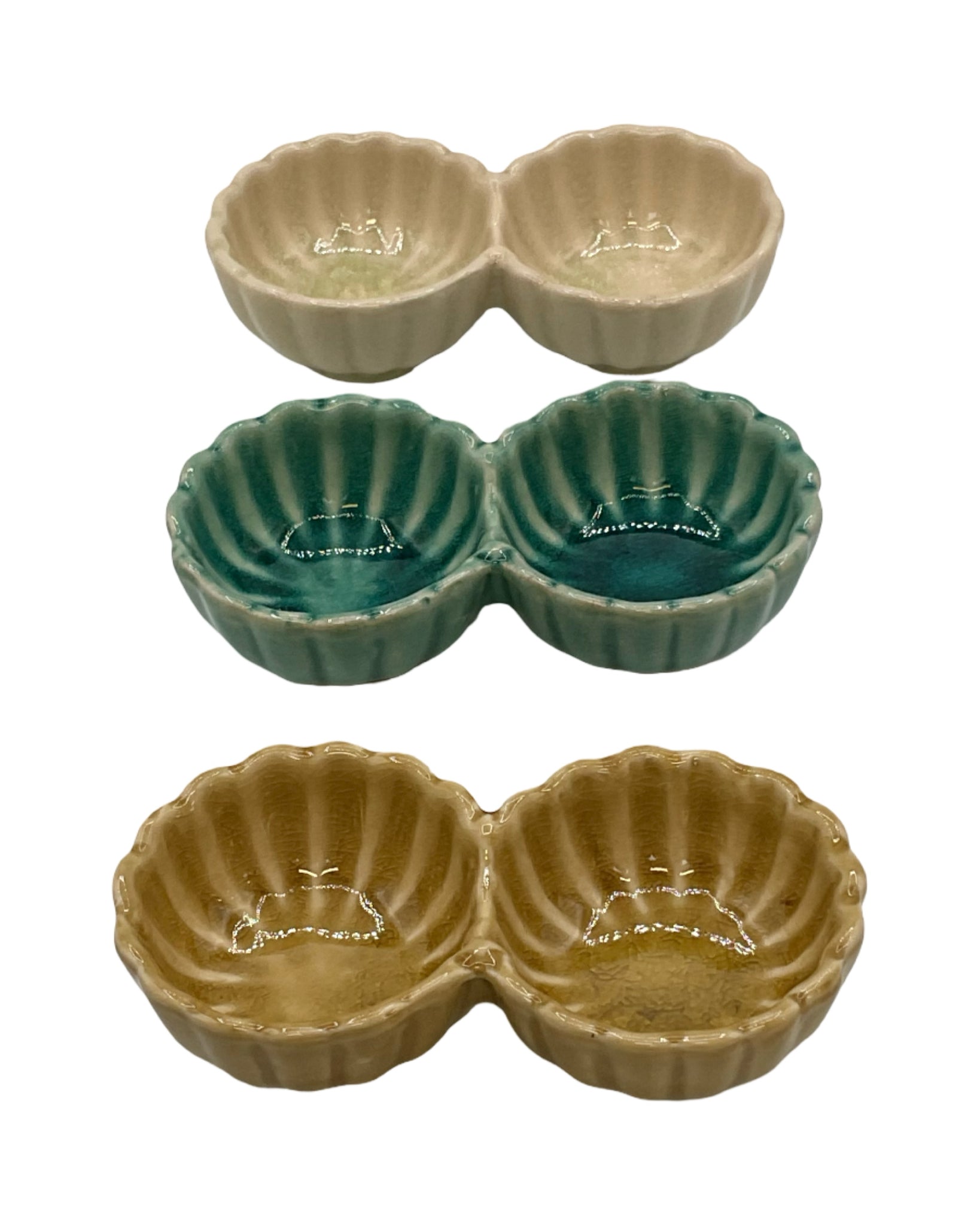 Set of 3 2-Sides Sauce Dipping Dishes ceramic teal gold & taupe with ribbed detailing