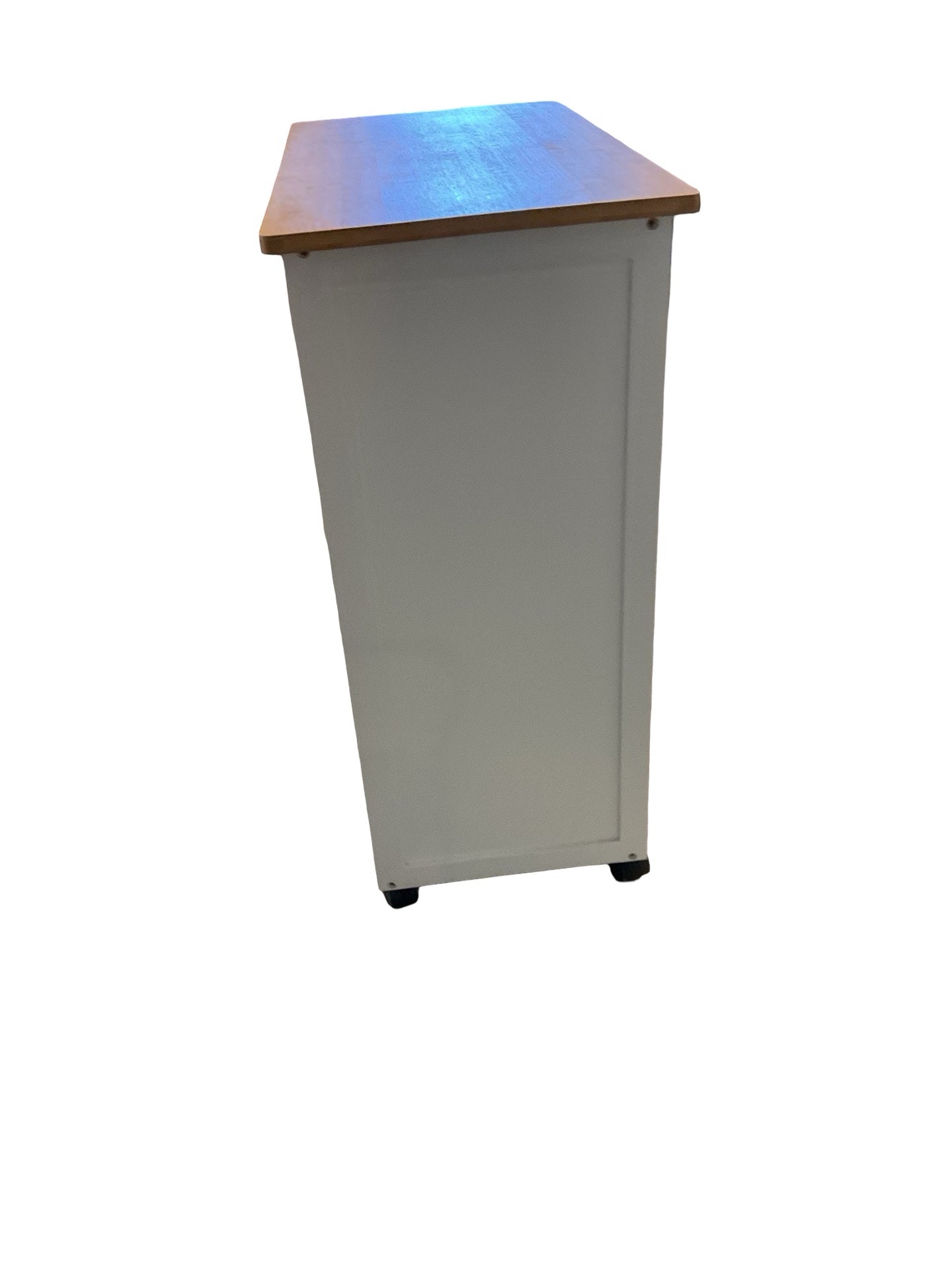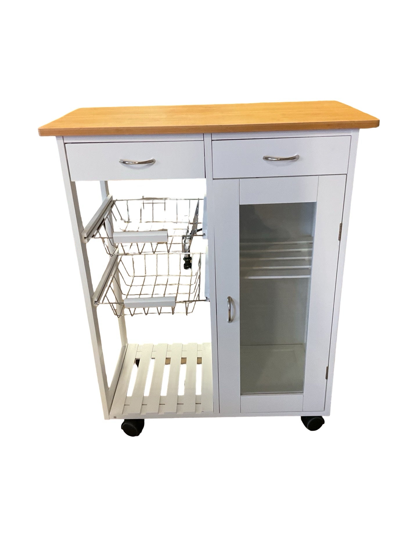 Rolling Cart white with brown wooden top 2 drawers 1 door 1 open shelf 2 wire baskets 27.5"W x 14.5"D x 33.5"H