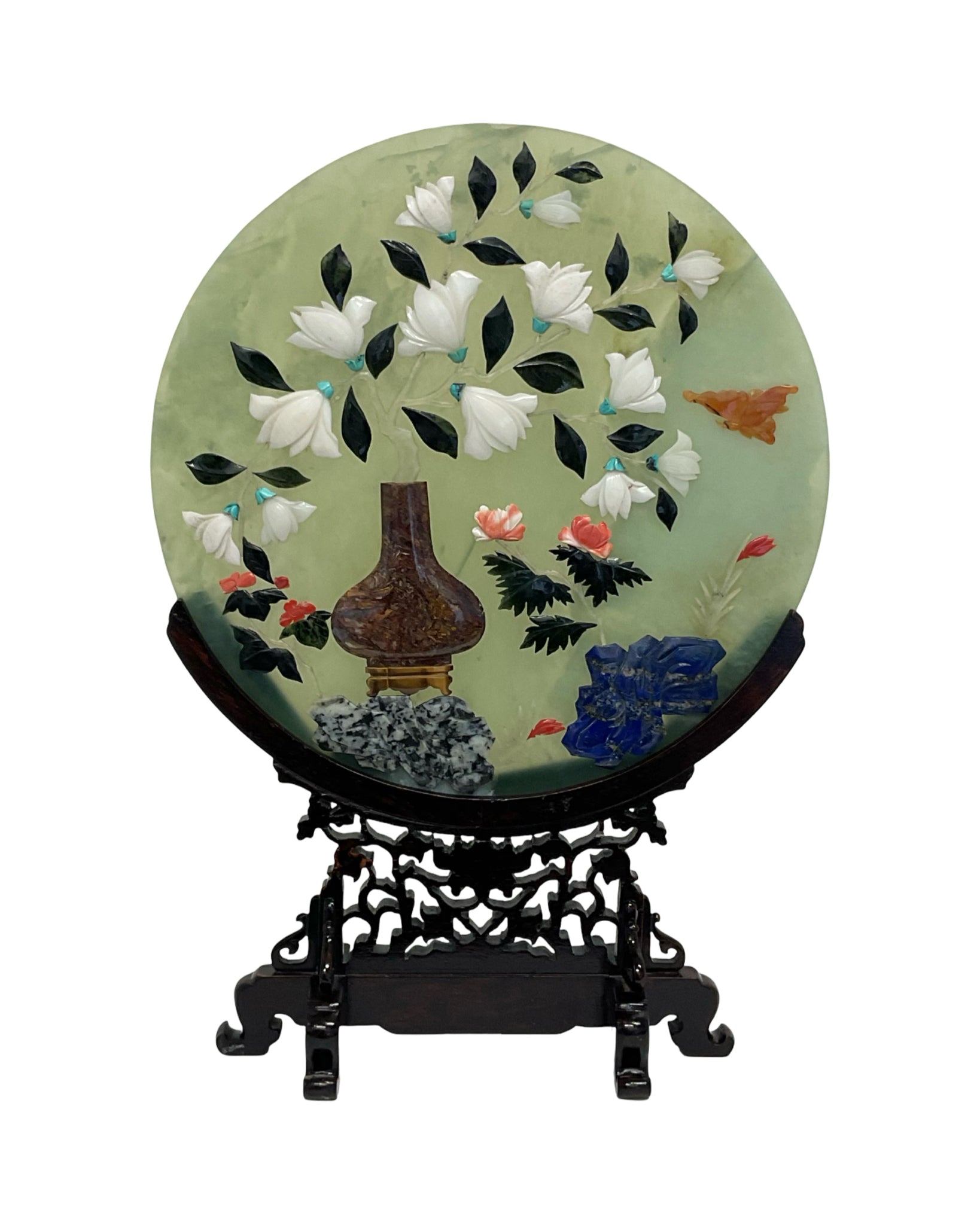 Tablescreen on Wooden Stand semi precious stones Floral & Butterfly Motif
