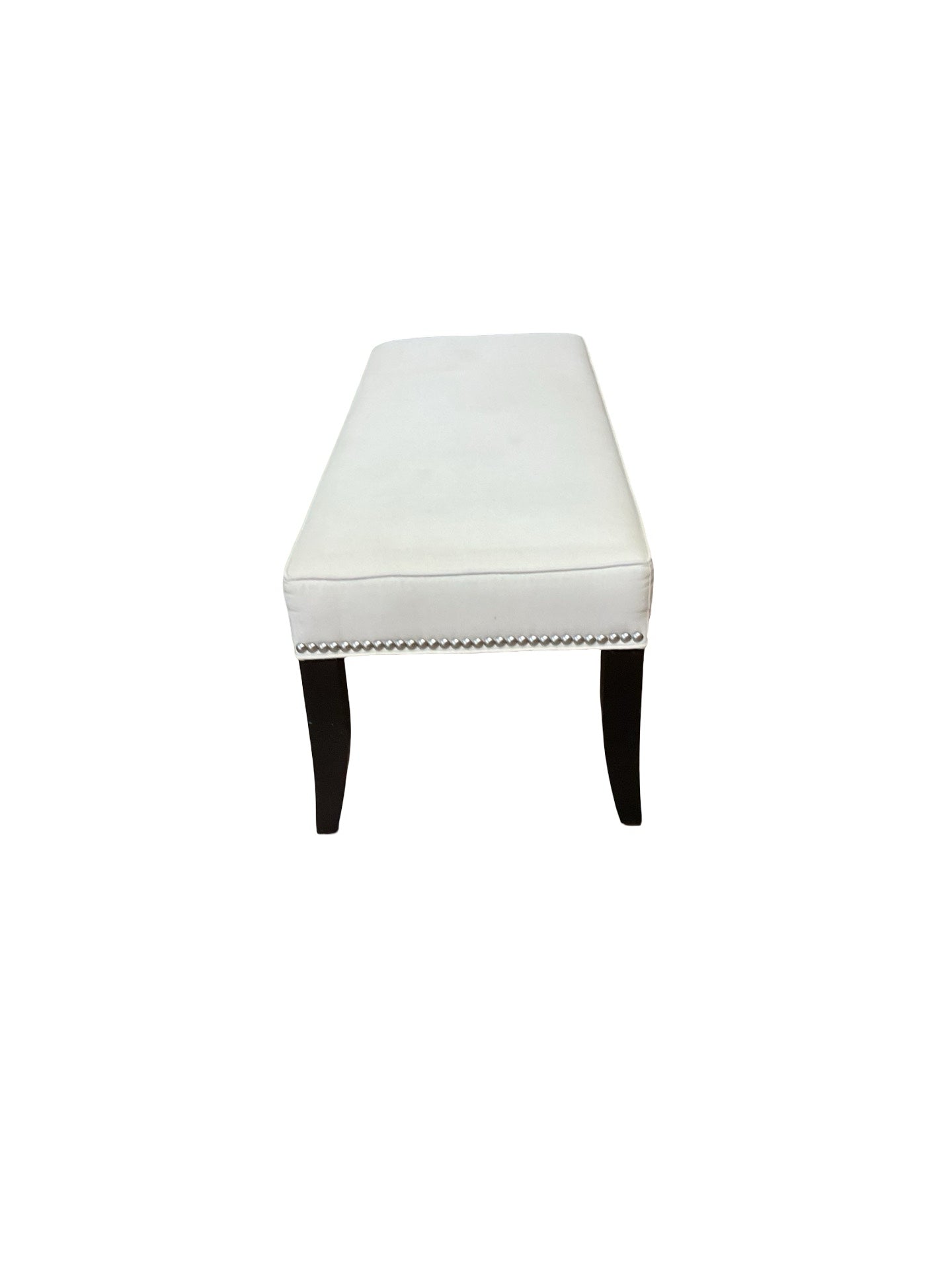 Bench Crate & Barrel taupe upholstery with stud detailing and brown wooden legs 52"W x 20"D x 18'H