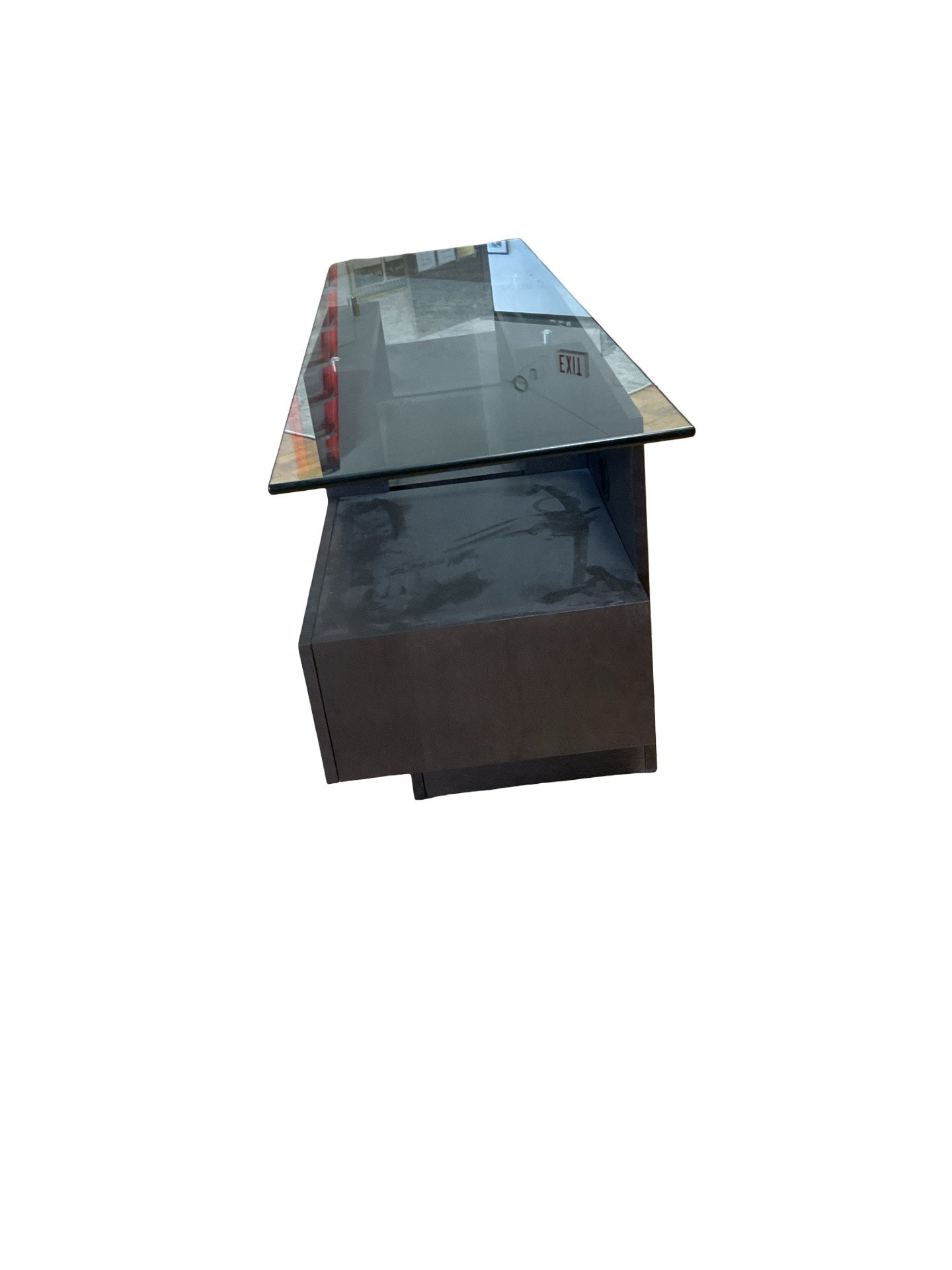 TV Stand dark wooden finish 3 drawers 3 open cubby holes with glass top 62"W x 18"D x 21.5"H