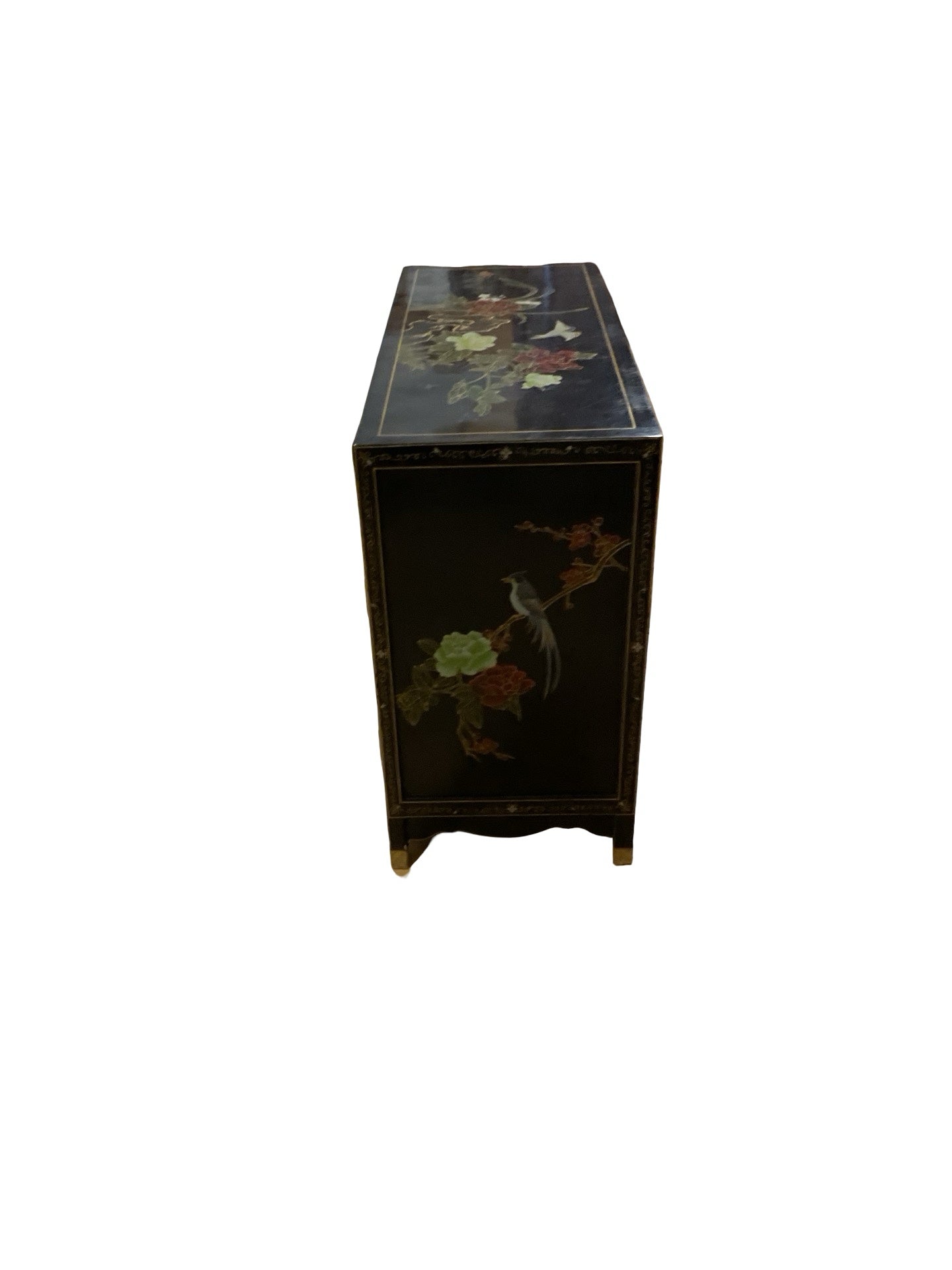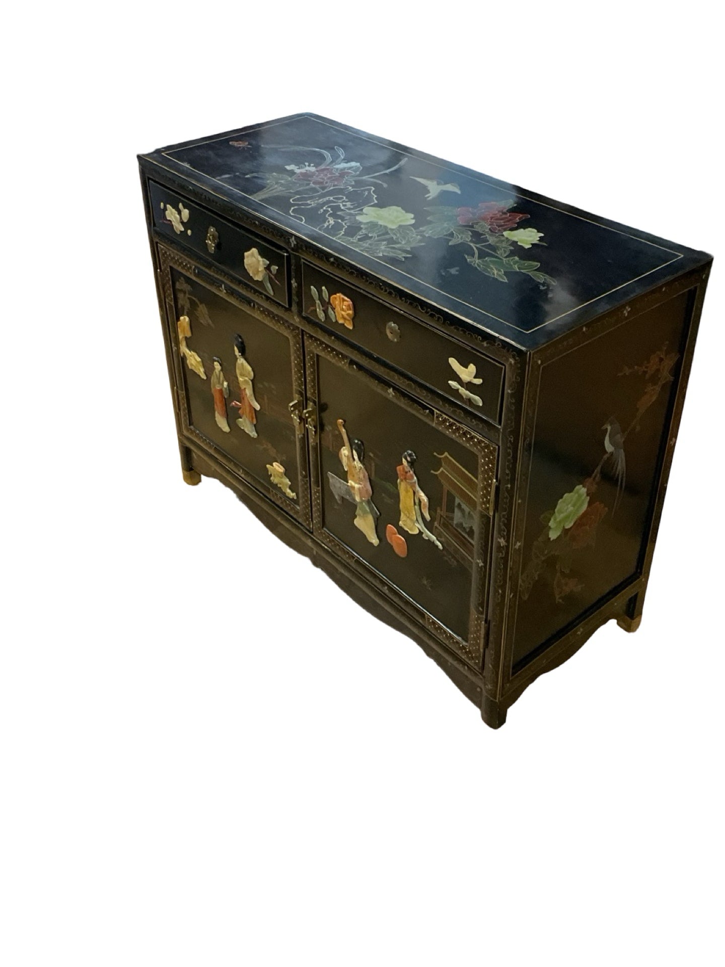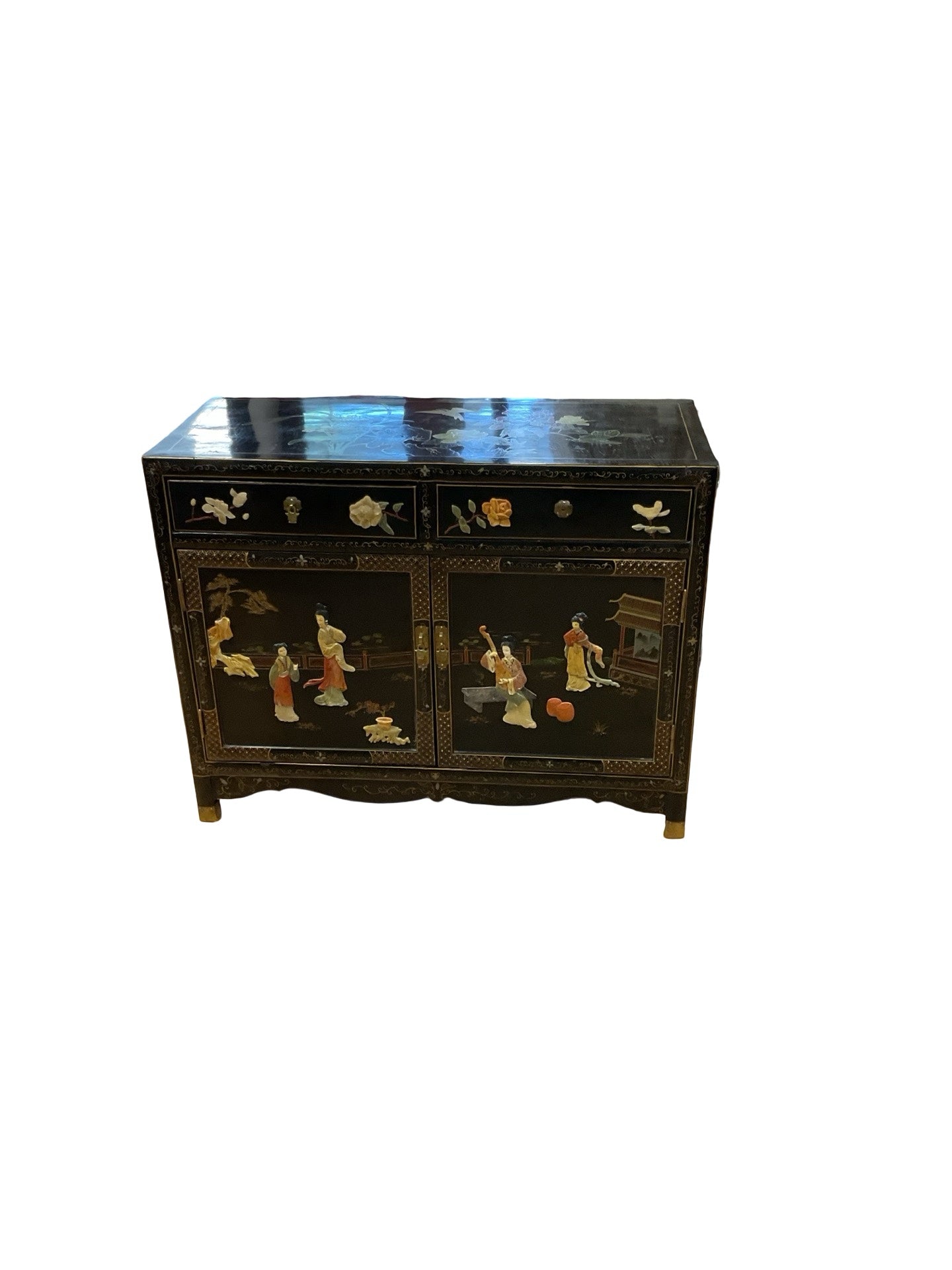 Chest black lacquer 2 drawers 2 doors asian motif 38"W x 16"D x 30"H