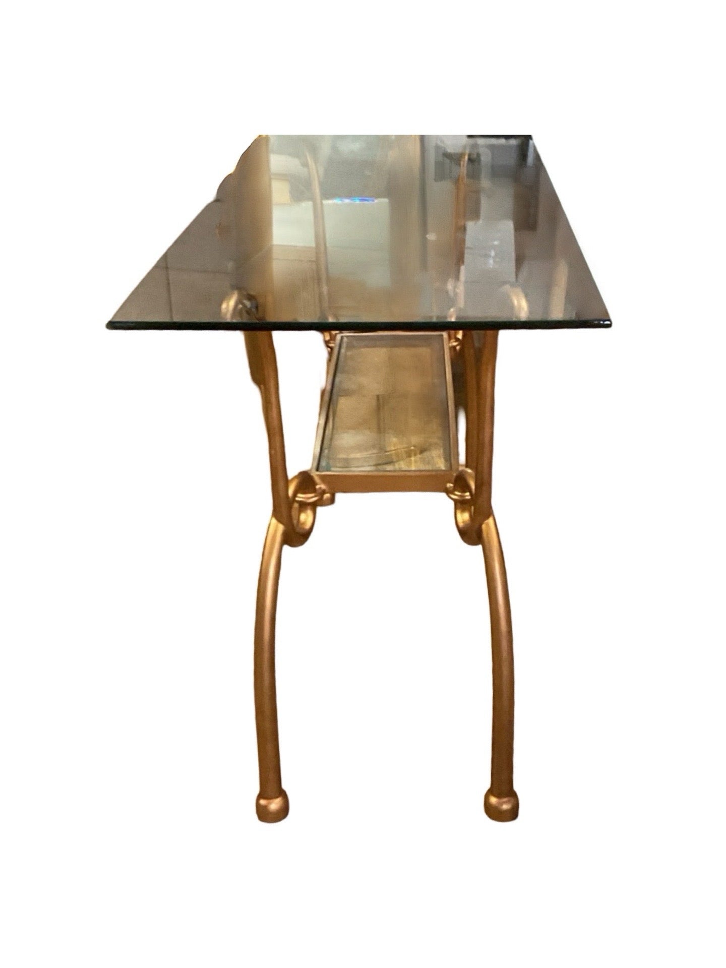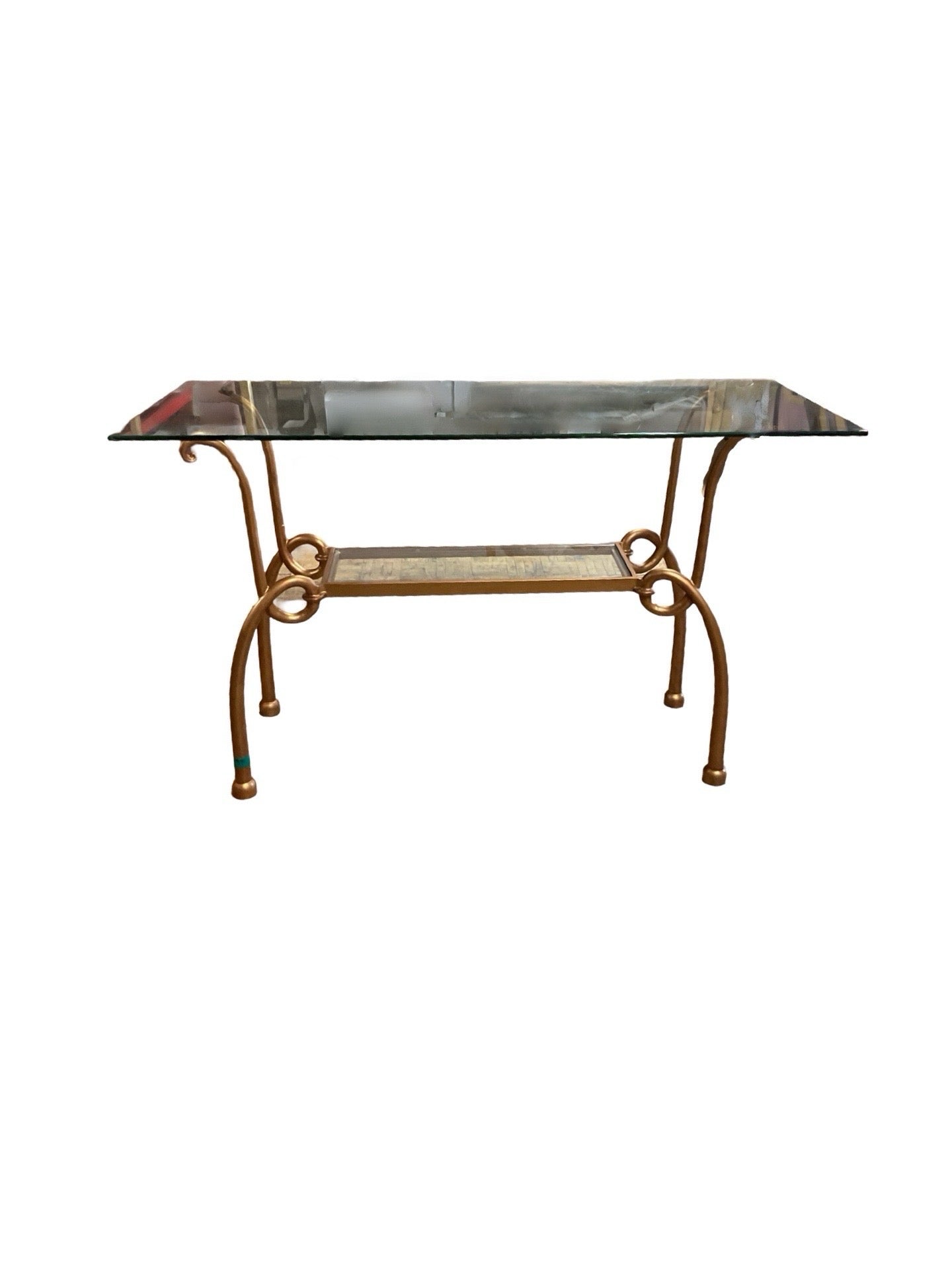 Console rectangle gold tone metal base with glass top 50"W x 20"D x 31'H