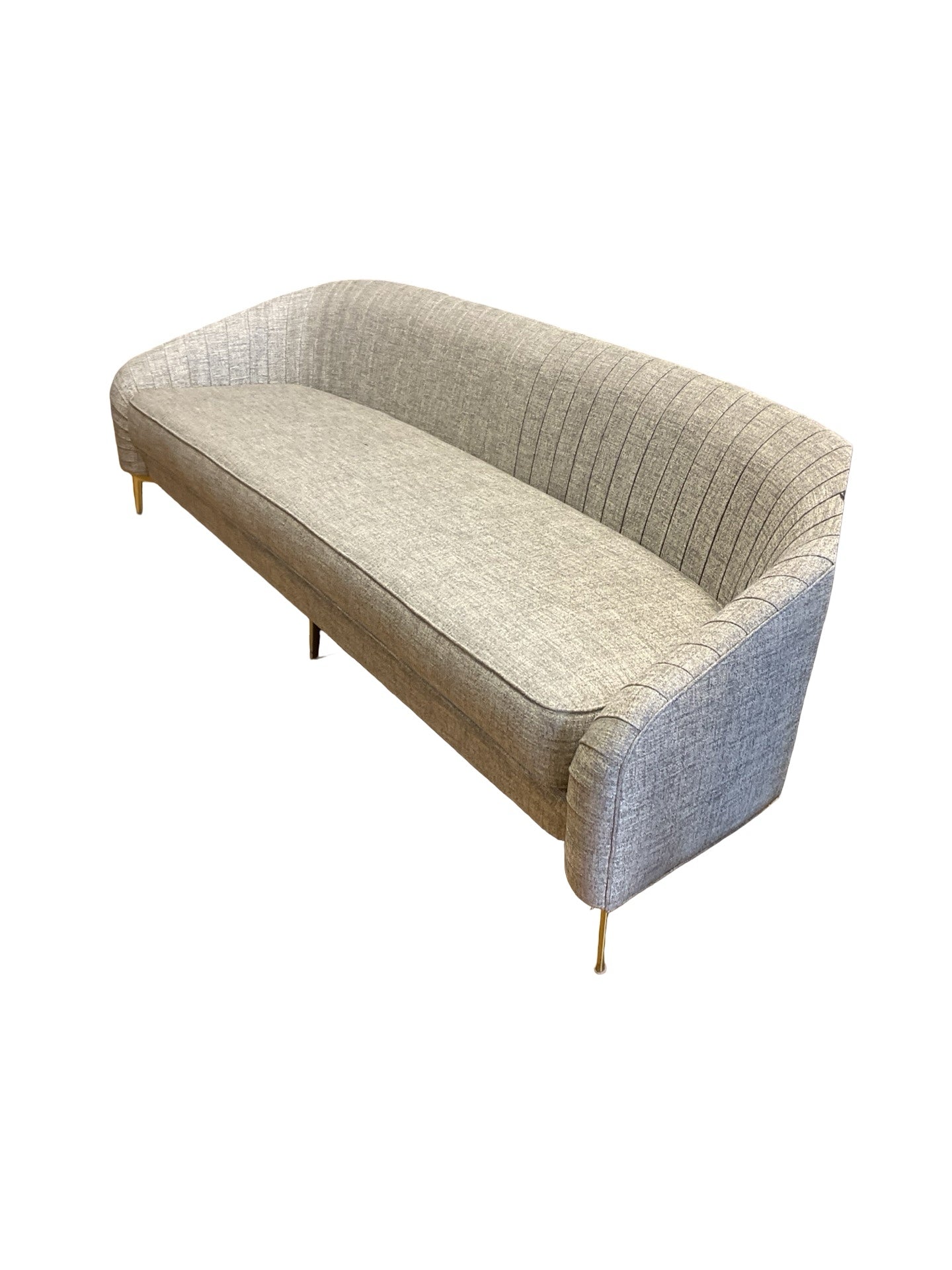 Sofa grey weave upholstery pleated back and side with brass tone legs 98"W x 34"D x 29"H